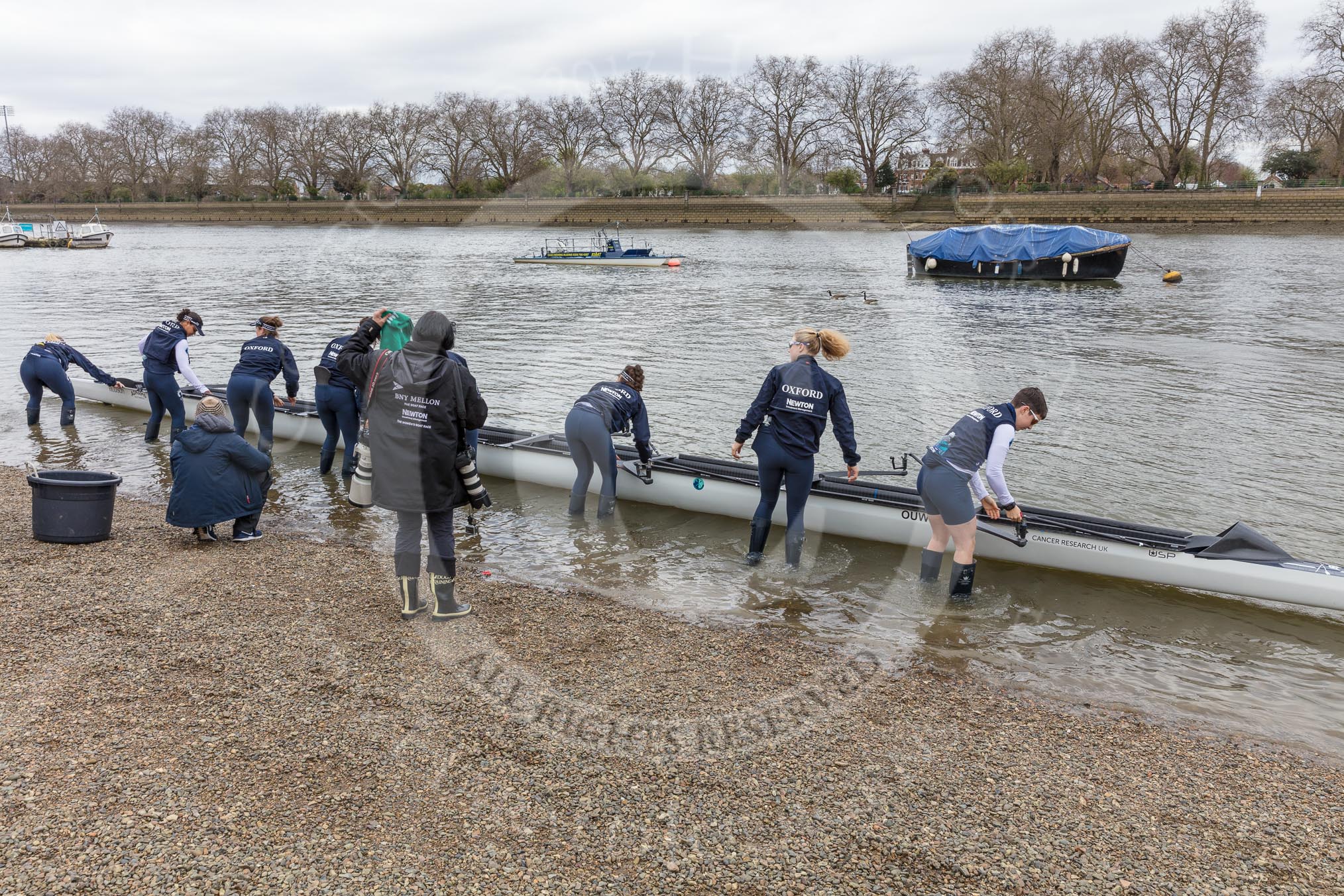 The Cancer Research UK Boat Race season 2017 - Women's Boat Race Fixture OUWBC vs Molesey BC: OUWBC turning their boat around to put it onto the river. River Thames between Putney Bridge and Mortlake, London SW15, United Kingdom, on 19 March 2017 at 15:17, image #5