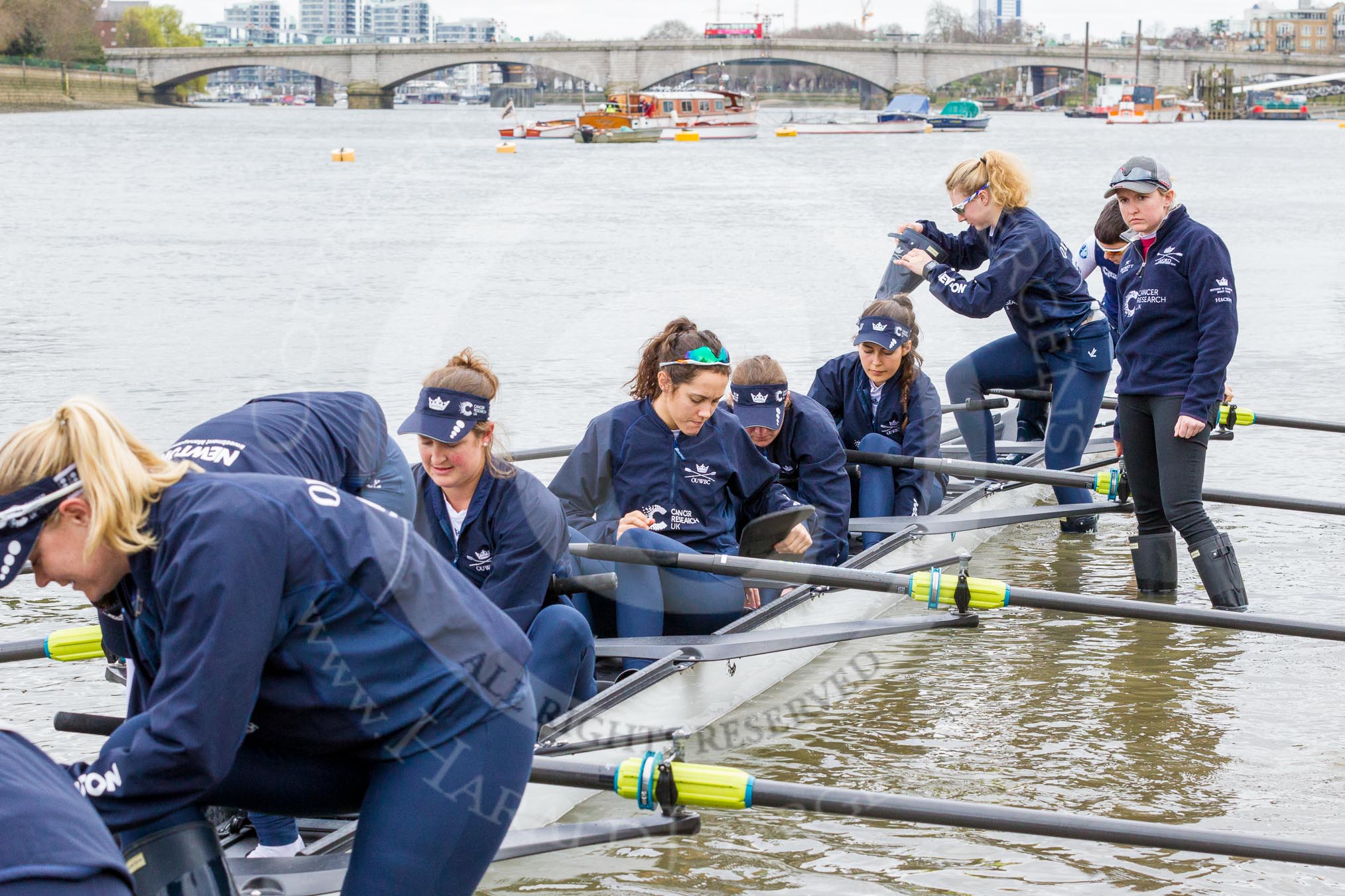 The Cancer Research UK Boat Race season 2017 - Women's Boat Race Fixture OUWBC vs Molesey BC: OUWBC ready to set off - S Emily Cameron, 7 Jenna Hebert, 6 Harriet Austin, 5 Chloe Laverack, 4 Rebecca Esselstein, 3 Rebecca Te Water Naude, 2 Beth Bridgman, B Alice Roberts, and on the right head coach Ali Williams. River Thames between Putney Bridge and Mortlake, London SW15, United Kingdom, on 19 March 2017 at 15:19, image #9