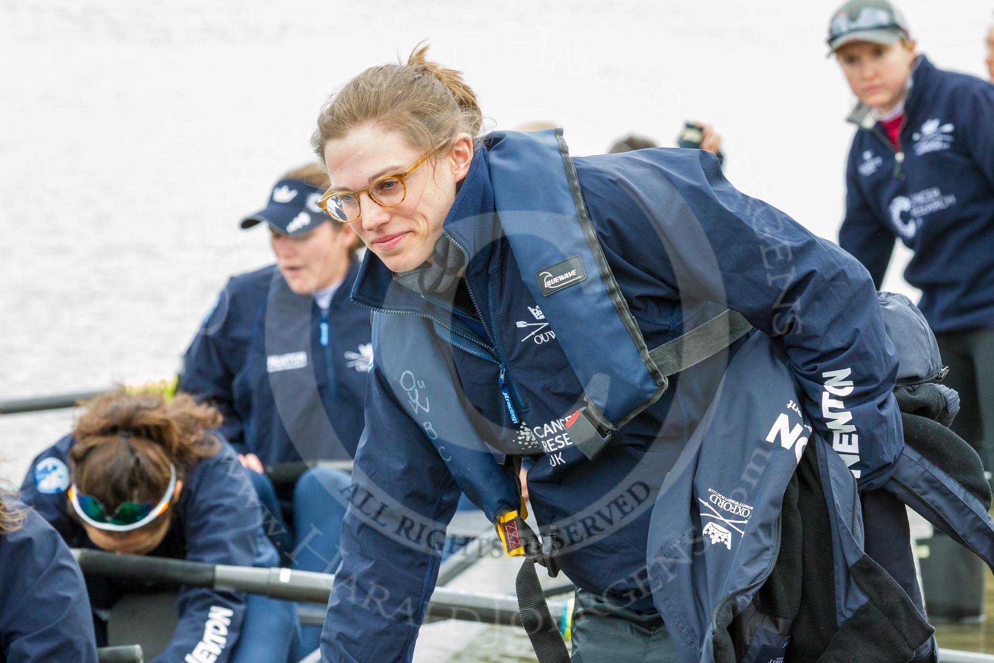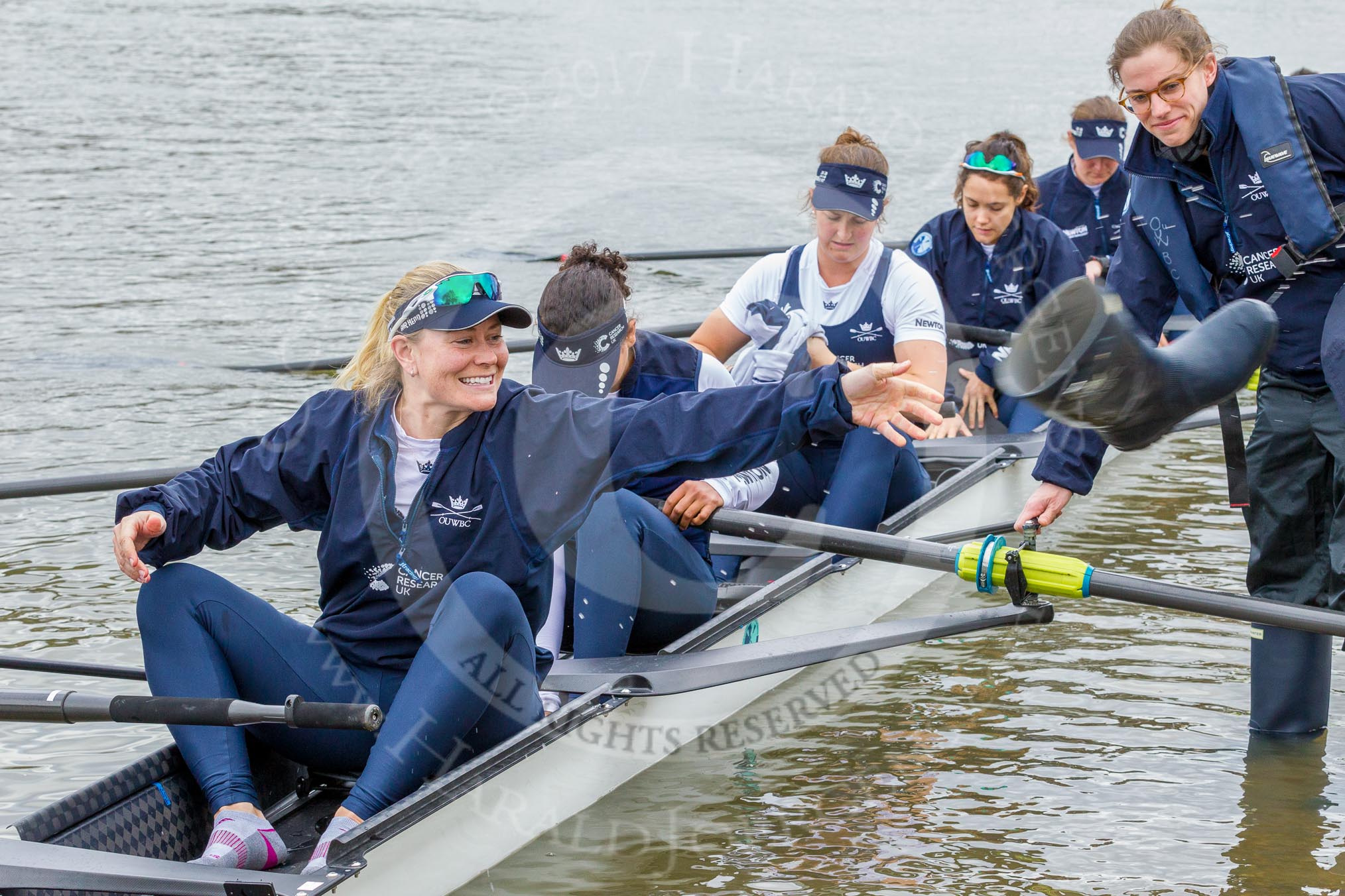 The Cancer Research UK Boat Race season 2017 - Women's Boat Race Fixture OUWBC vs Molesey BC: OUWBC getting their boat ready for the fixture - S Emily Cameron throwing wellies, , 7 Jenna Hebert, 6 Harriet Austin, 5 Chloe Laverack, 4 Rebecca Esselstein. River Thames between Putney Bridge and Mortlake, London SW15, United Kingdom, on 19 March 2017 at 15:20, image #11