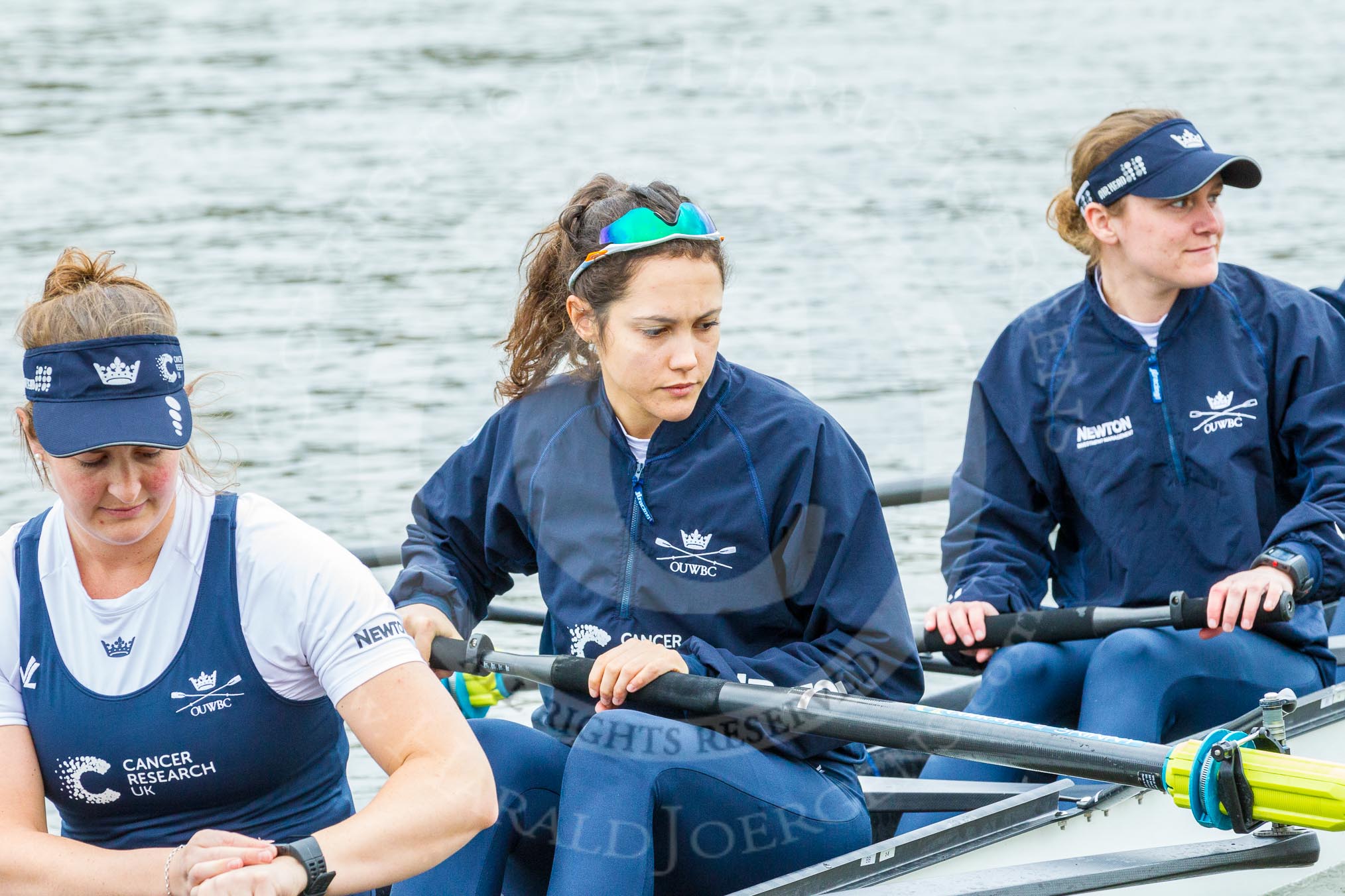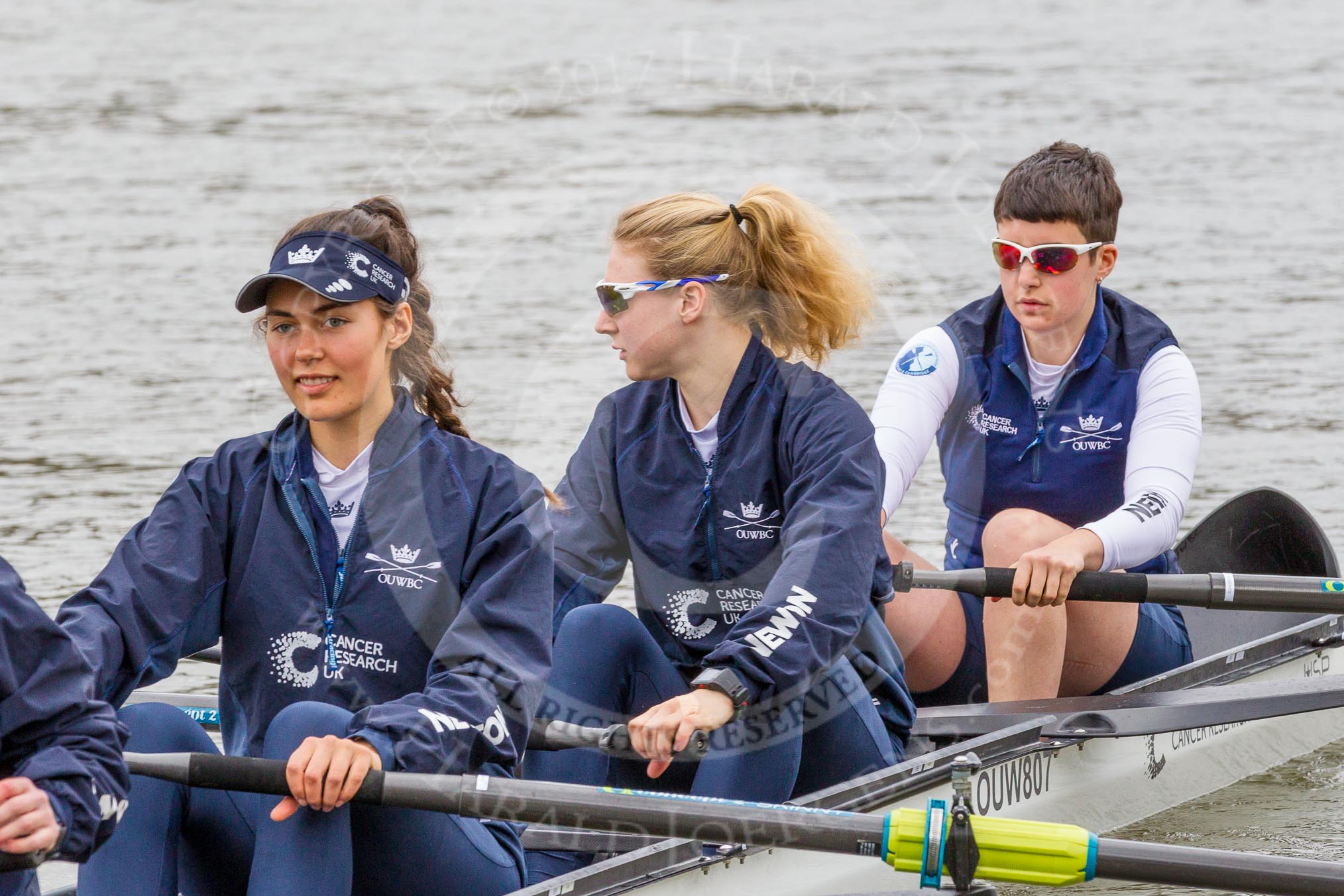 The Cancer Research UK Boat Race season 2017 - Women's Boat Race Fixture OUWBC vs Molesey BC: The OUWBC boat, here 3 seat Rebecca Te Water Naude, 2 seat Beth Bridgman and bow Alice Roberts. River Thames between Putney Bridge and Mortlake, London SW15, United Kingdom, on 19 March 2017 at 15:20, image #14