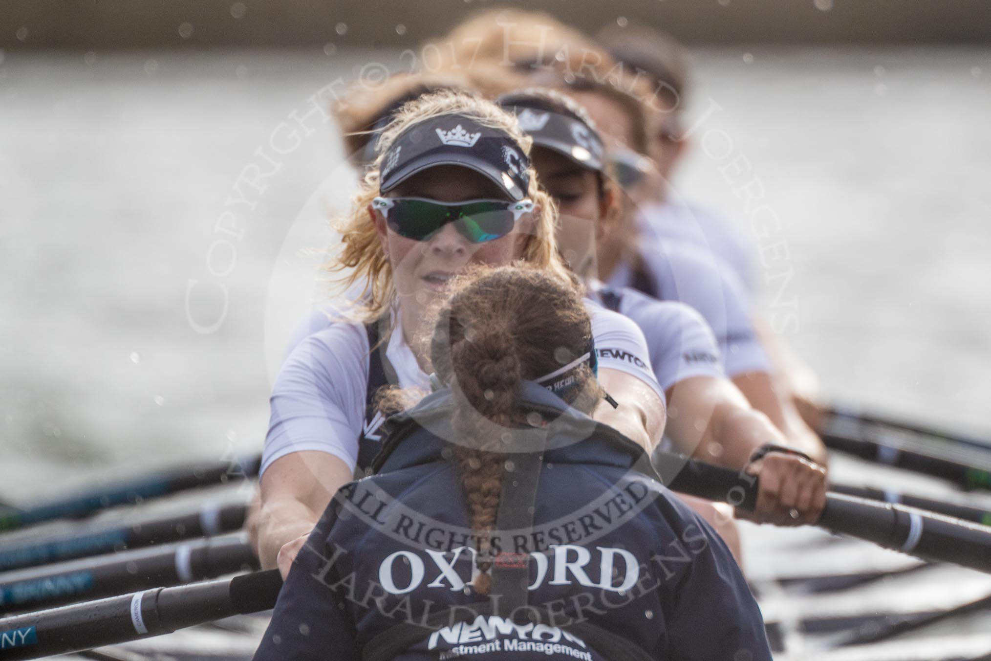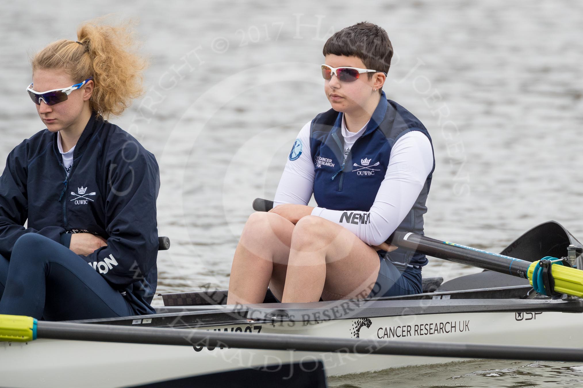 The Cancer Research UK Boat Race season 2017 - Women's Boat Race Fixture OUWBC vs Molesey BC: The OUWBC boat, here 2 seat Beth Bridgman and bow Alice Roberts. River Thames between Putney Bridge and Mortlake, London SW15, United Kingdom, on 19 March 2017 at 15:21, image #15