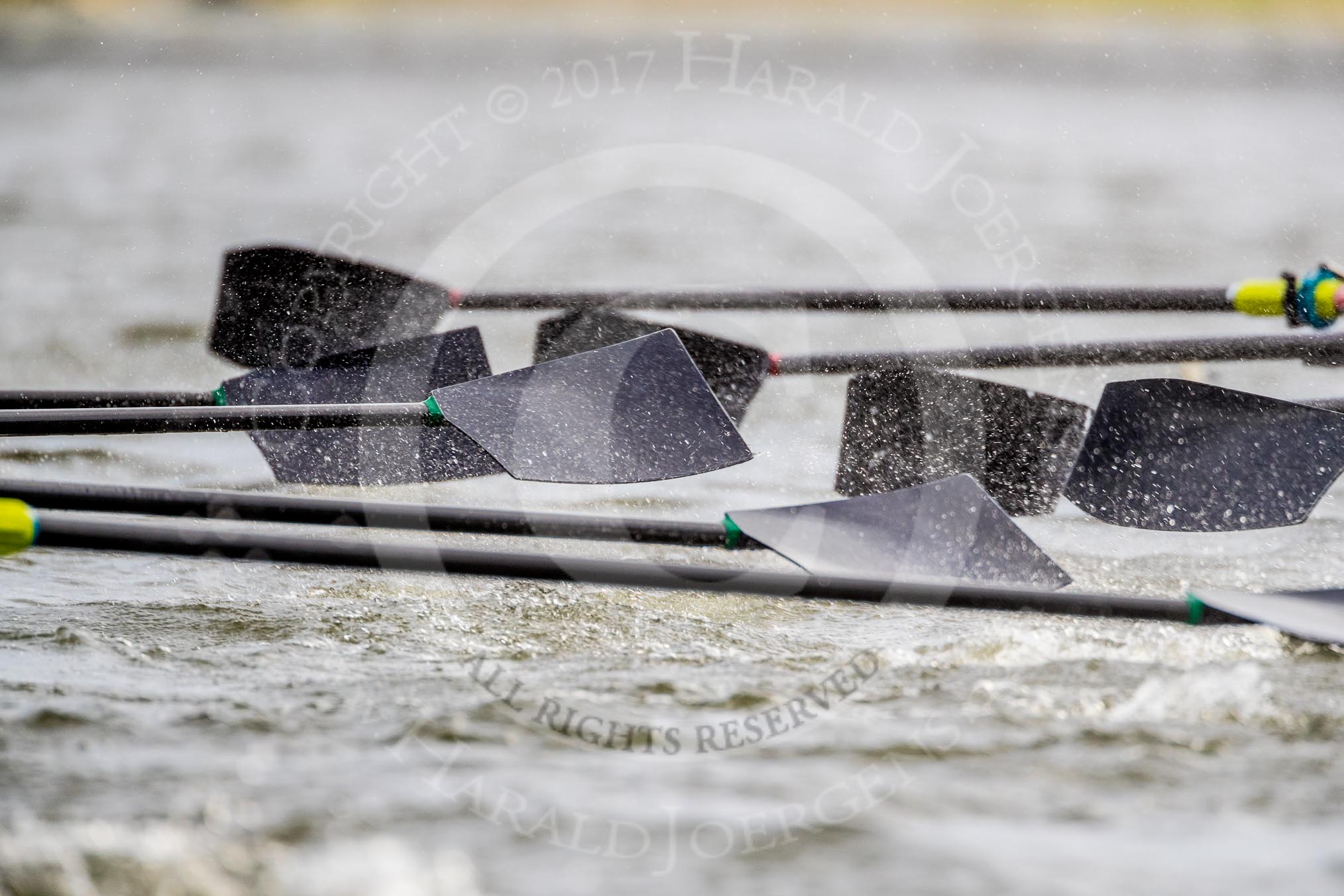 The Cancer Research UK Boat Race season 2017 - Women's Boat Race Fixture OUWBC vs Molesey BC: Molesey and OUWBC getting a bit close, with almost overlapping oars.