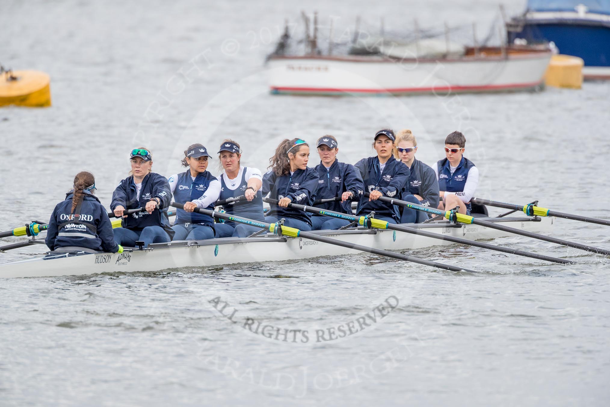 The Cancer Research UK Boat Race season 2017 - Women's Boat Race Fixture OUWBC vs Molesey BC: The OUWBC boat - cox Eleanor Shearer, stroke Emily Cameron, 7 Jenna Hebert, 6 Harriet Austin, 5 Chloe Laverack, 4 Rebecca Esselstein, 3 Rebecca Te Water Naude, 2 Beth Bridgman, bow Alice Roberts. River Thames between Putney Bridge and Mortlake, London SW15, United Kingdom, on 19 March 2017 at 15:21, image #20