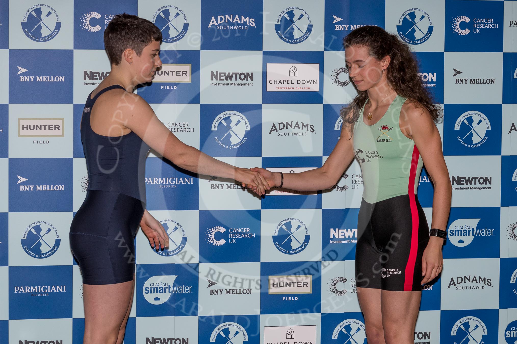 The Boat Race season 2017 - Crew Announcement and Weigh-In: In the 3 seat - Claire Lambe, OUWBC, and Rebecca Esselstein, CUWBC.