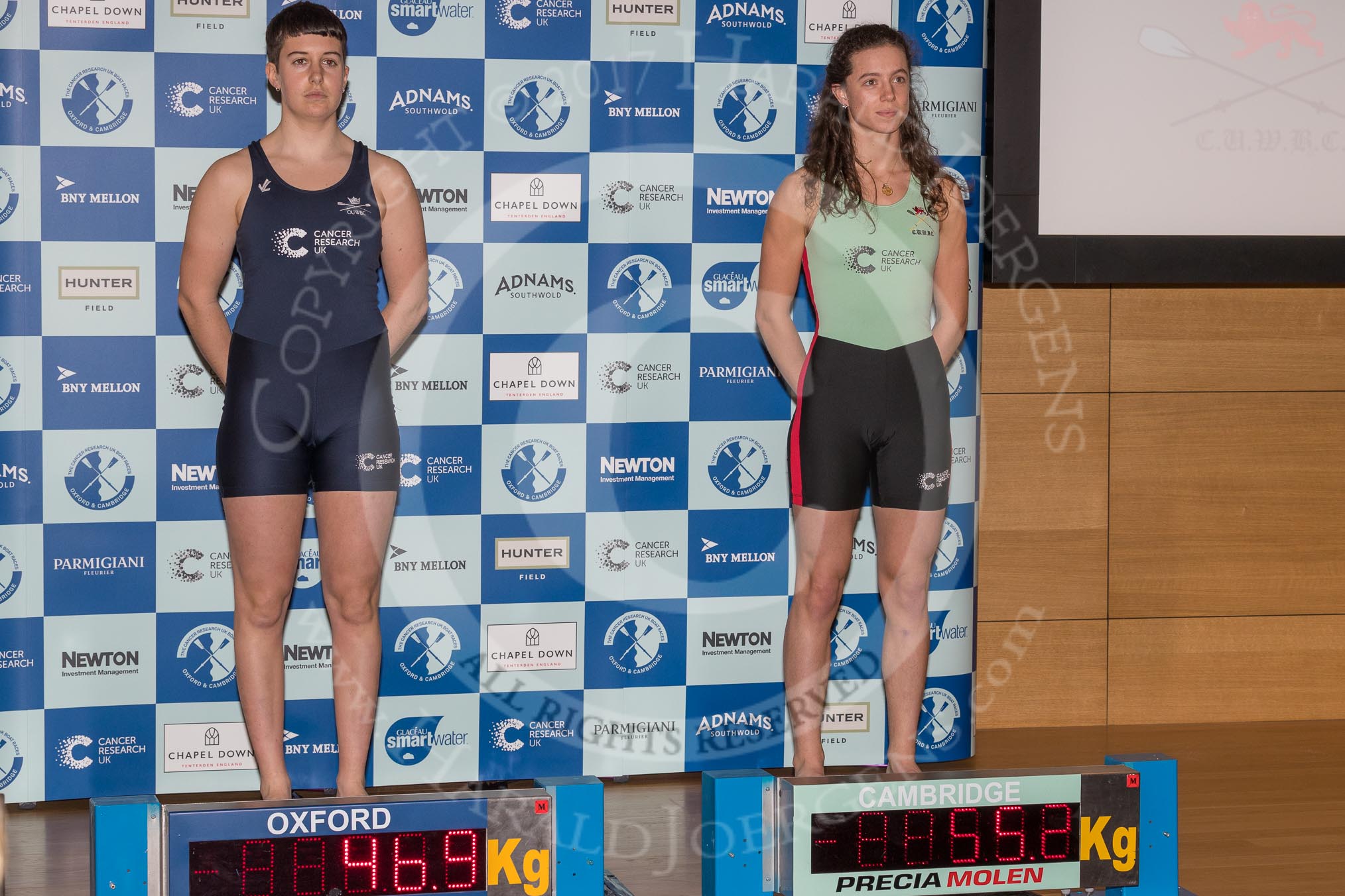 The Boat Race season 2017 - Crew Announcement and Weigh-In: Bow - Flo Pickles (OUWBC, left) and Ashton Brown.