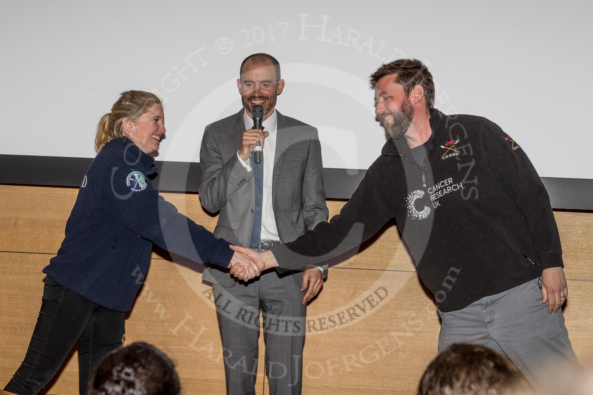 The Boat Race season 2017 - Crew Announcement and Weigh-In: BBC Sport commentator Andrew Cotter with the Head Coaches Ali Williams (OUWBC) and Rob Baker (CUWBC).