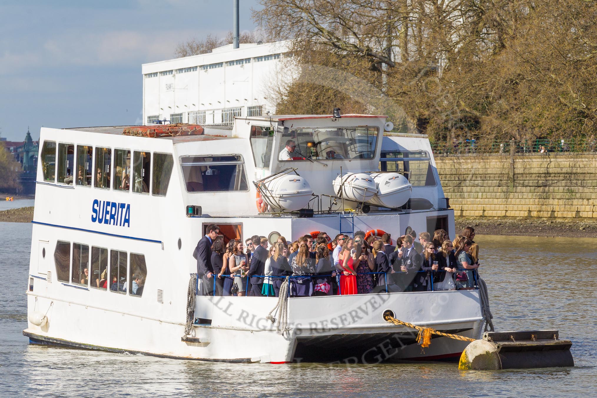 The Boat Race season 2017 - The Cancer Research Women's Boat Race: London River Cruises catamaran cruiser Suerita with guests watching the Boat Race from a unique perspective.
