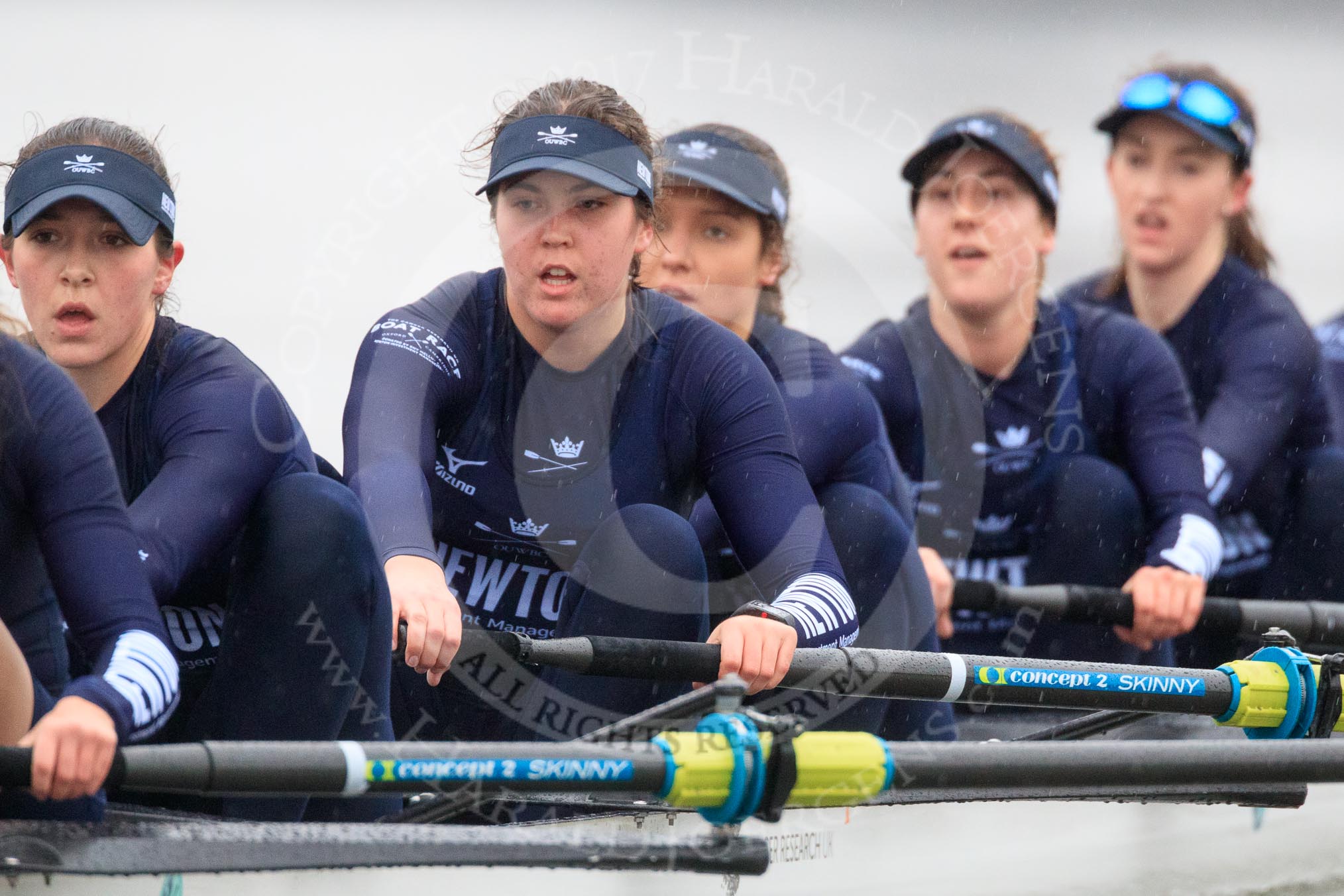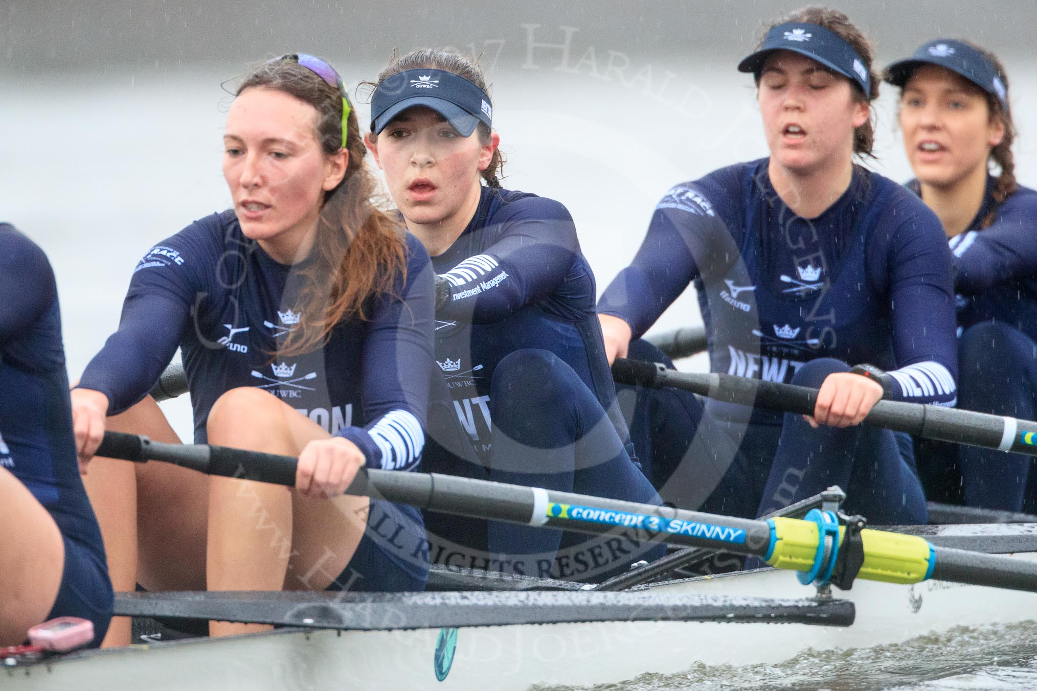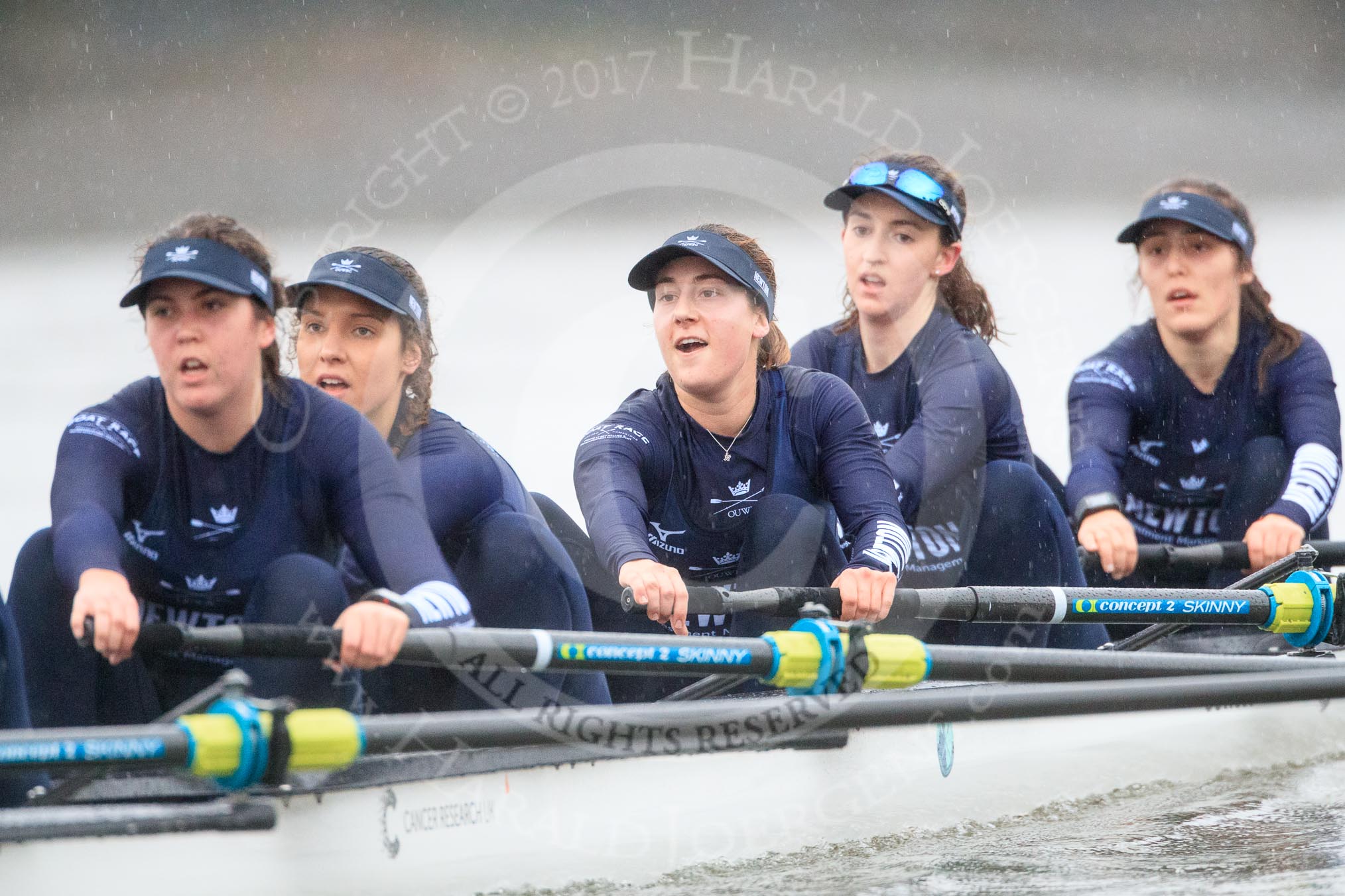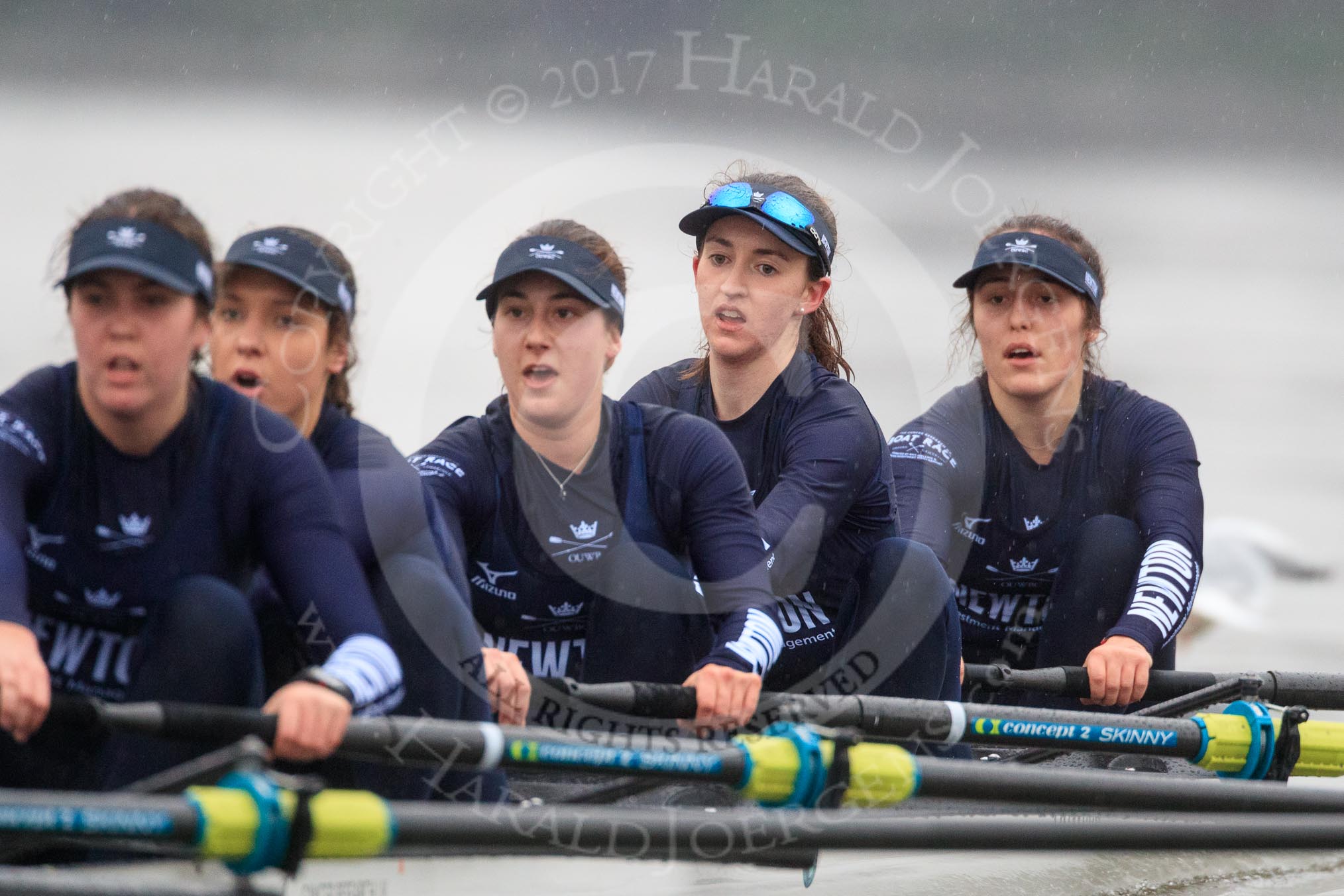 The Boat Race season 2018 - Women's Boat Race Trial Eights (OUWBC, Oxford): "Coursing River" approaching Chiswick Pier - 5 Morgan McGovern, 4 Anna Murgatroyd.