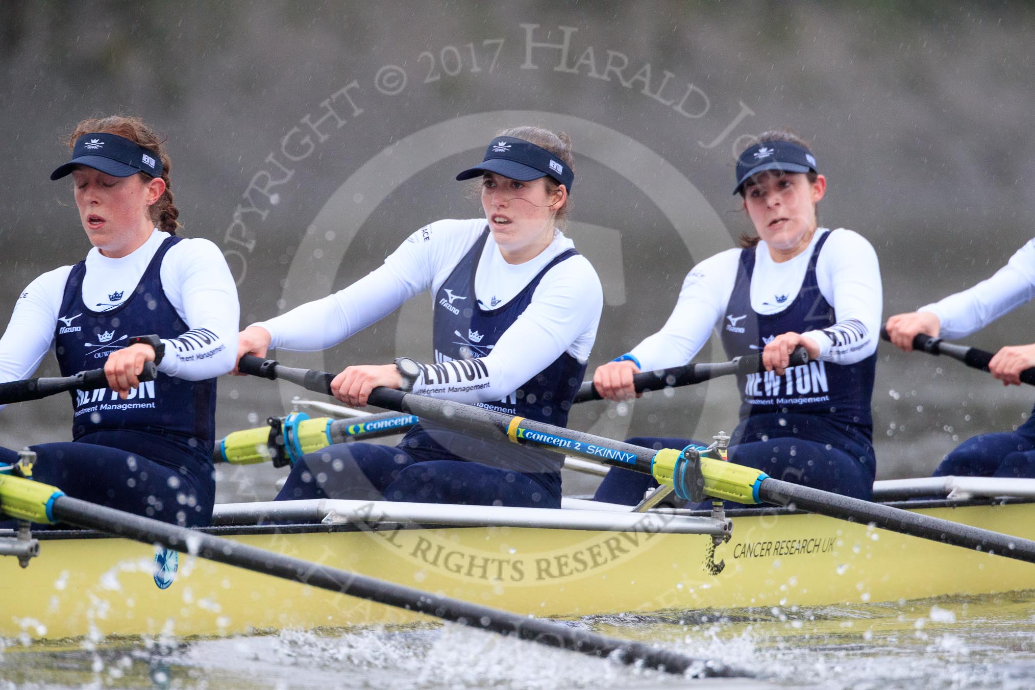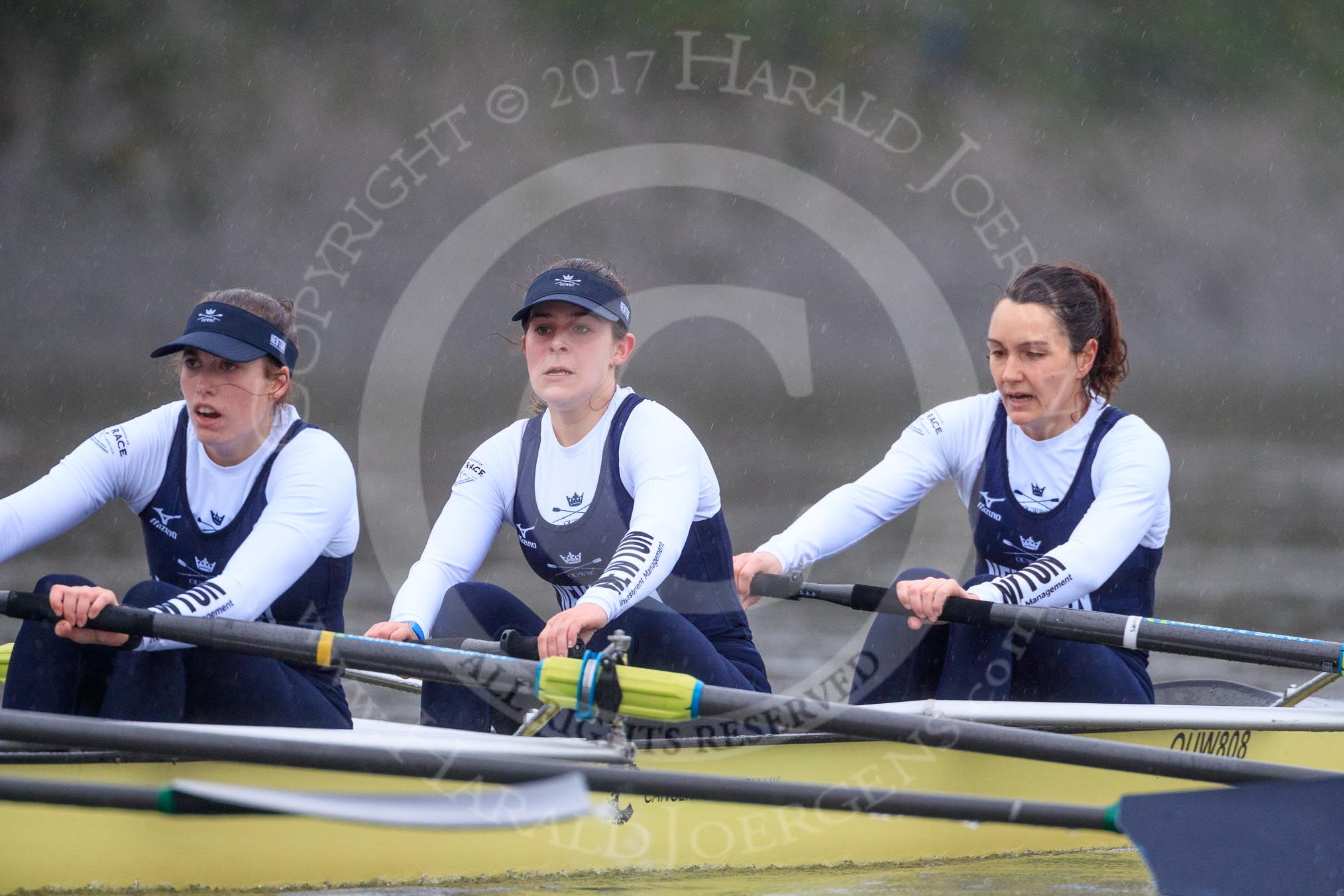 The Boat Race season 2018 - Women's Boat Race Trial Eights (OUWBC, Oxford): "Coursing River" approaching Chiswick Pier - 5 Morgan McGovern, 4 Anna Murgatroyd, 3 Stefanie Zekoll.