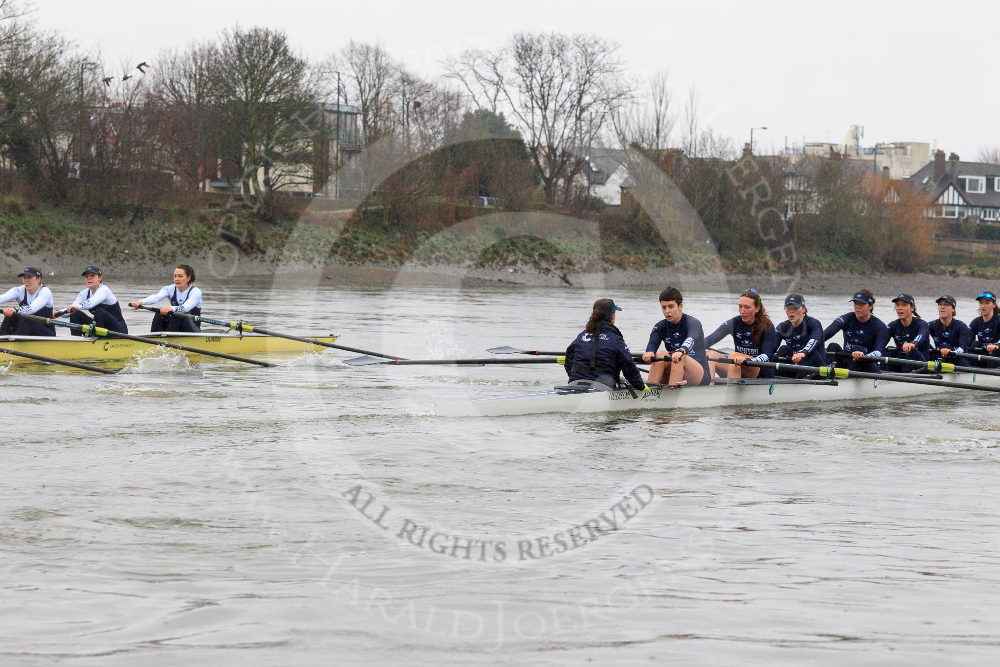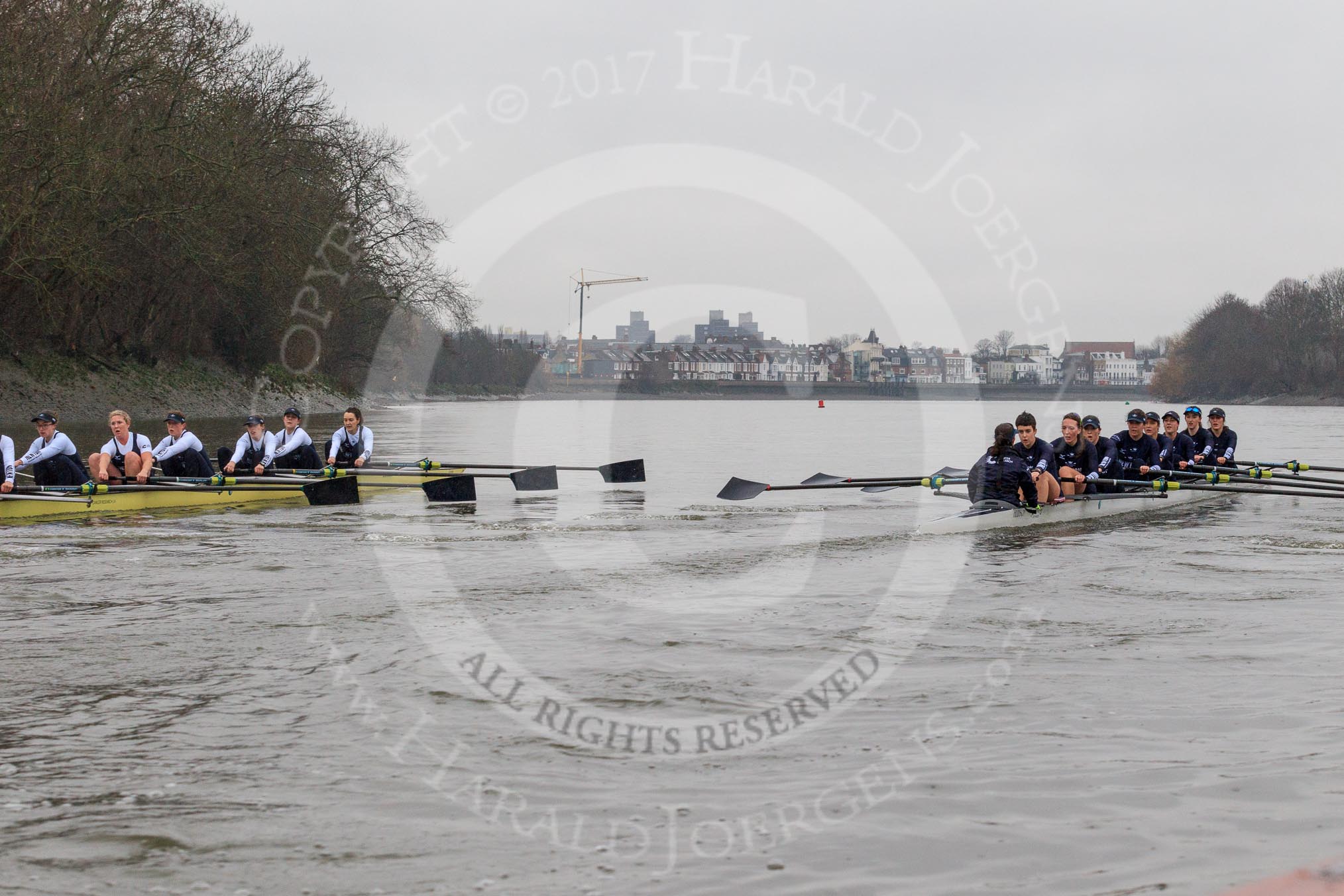 The Boat Race season 2018 - Women's Boat Race Trial Eights (OUWBC, Oxford): "Great Typhoon" and "Coursing River" near Chiswick Pier.