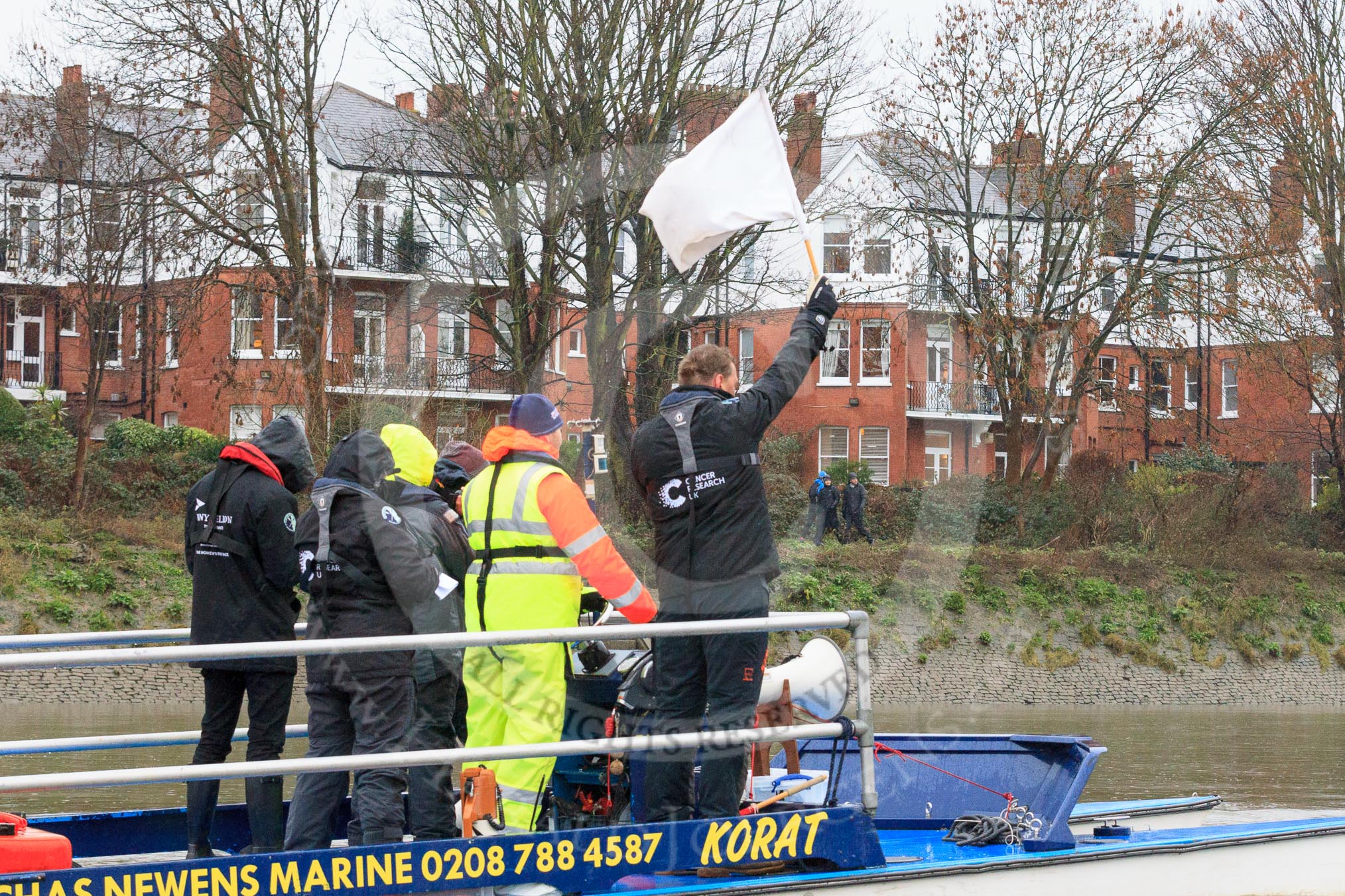 The Boat Race season 2018 - Women's Boat Race Trial Eights (OUWBC, Oxford): Race umpire Sir Matthew Pinsent warning the crews as they are getting too close.