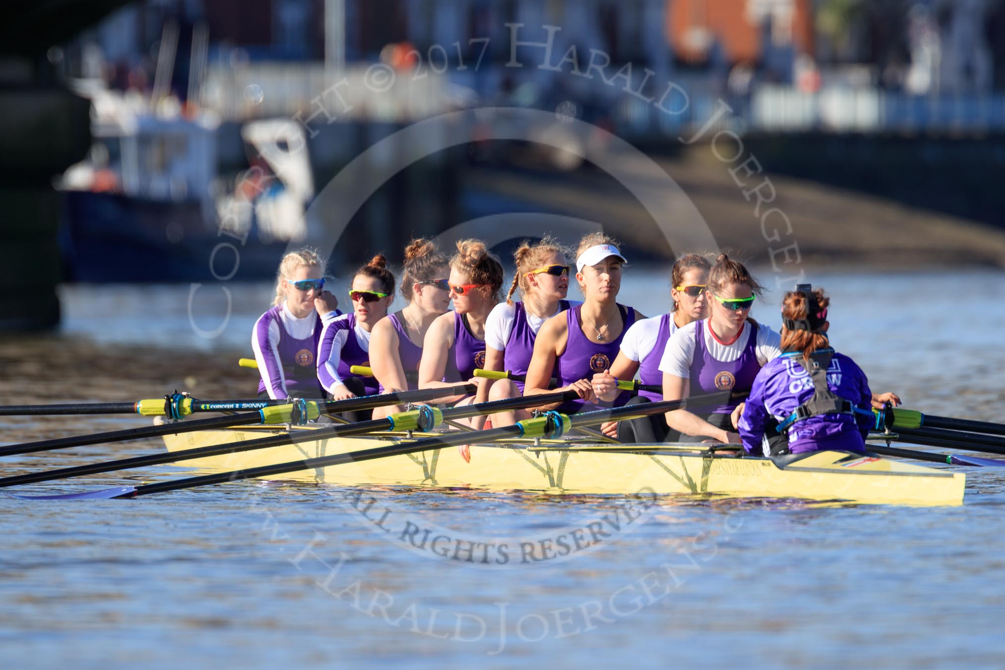 The Women's Boat Race season 2018 - fixture CUWBC vs. ULBC: ULBC at Putney Bridge, getting ready for the race - bow Ally French, 2 Robyn Hart-Winks, 3 Fionnuala Gannon, 4 Katherine Barnhill, 5 Hannah Roberts, 6 Oonagh Cousins, 7 Jordan Cole-Huissan, stroke Issy Powel, cox Lauren Holland.