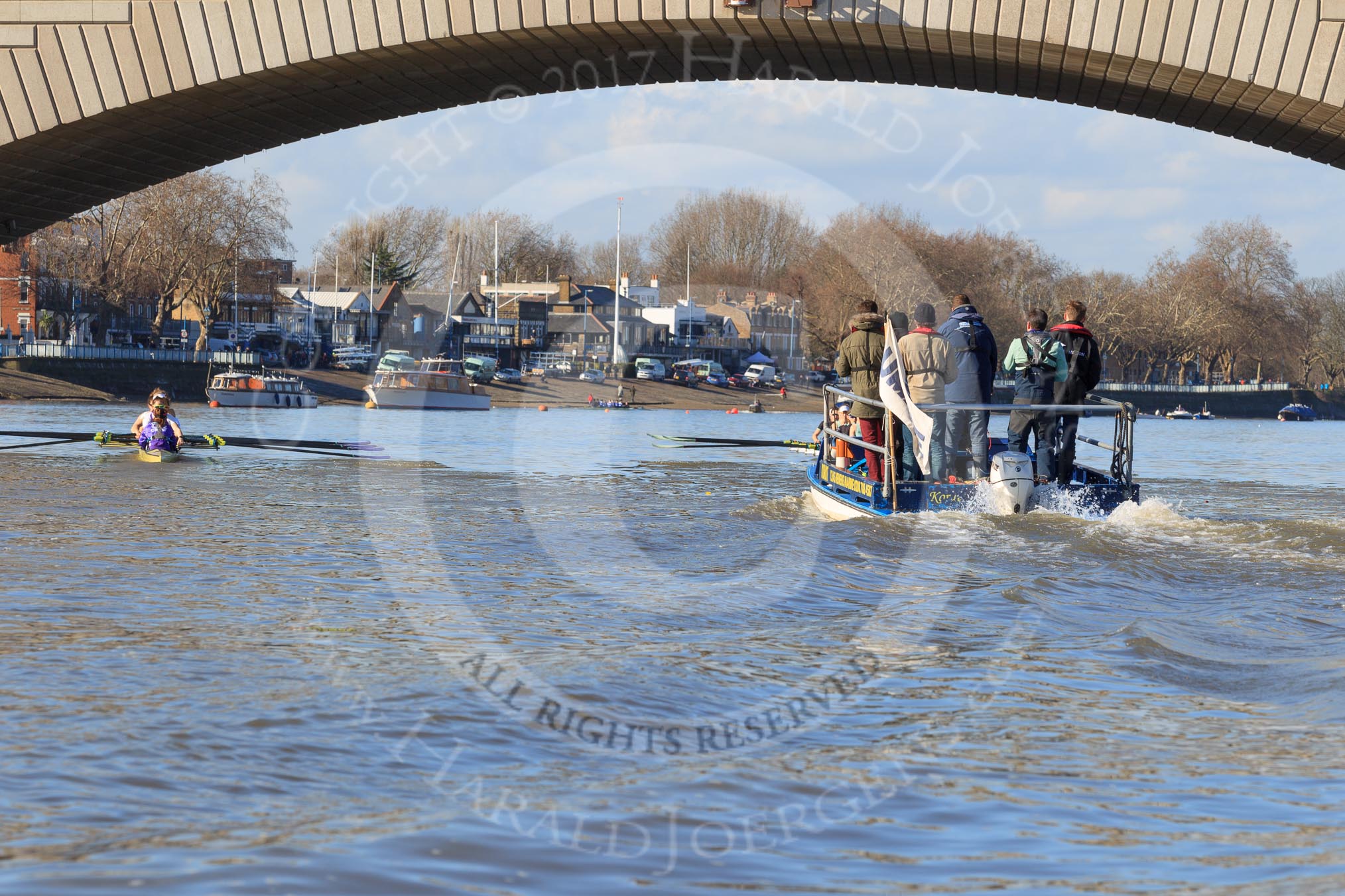 The Women's Boat Race season 2018 - fixture CUWBC vs. ULBC: ULBC, on the left, and CUWBC, in front of the umpire's boat, below Putney Bridge, rowuing towards their start positions.