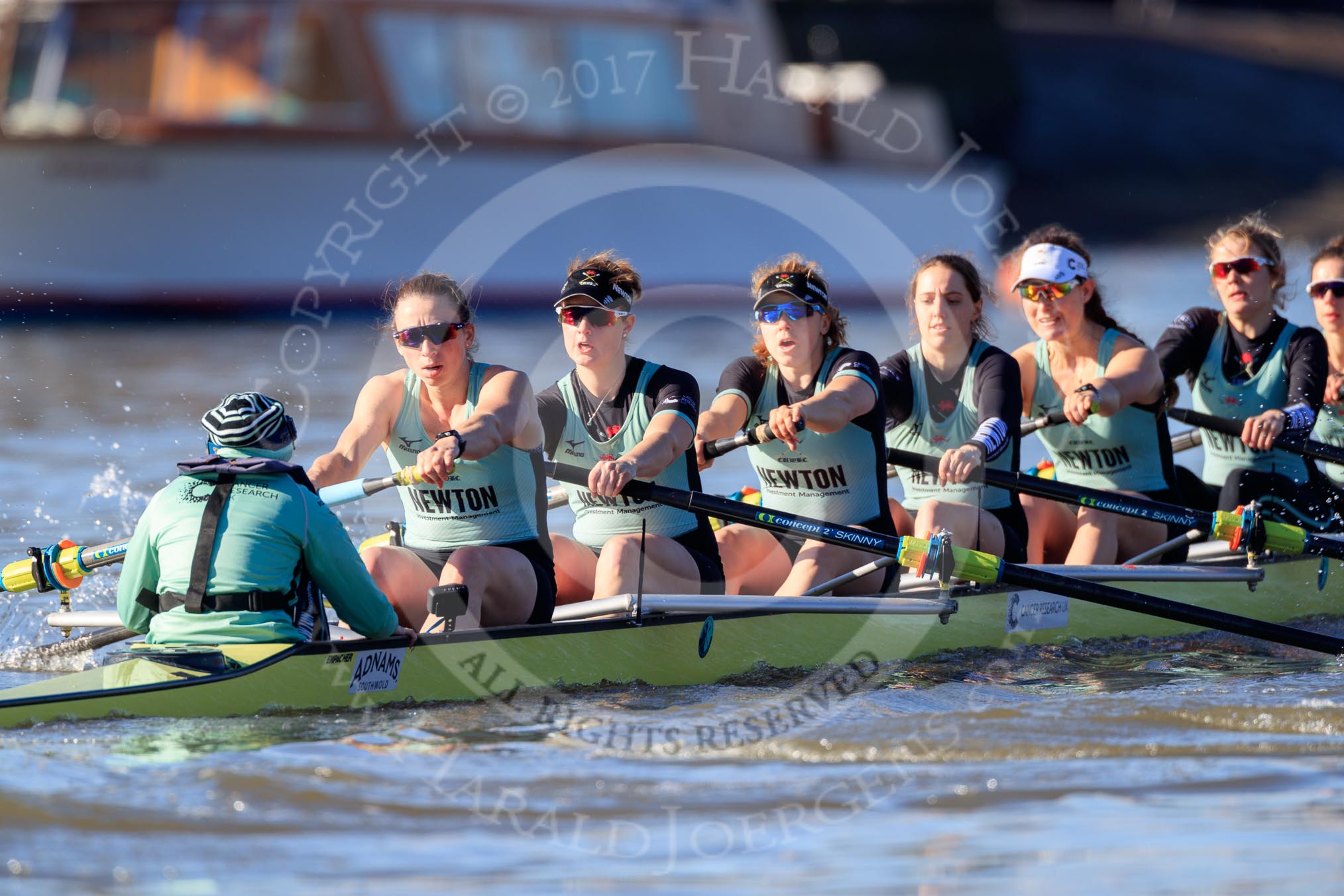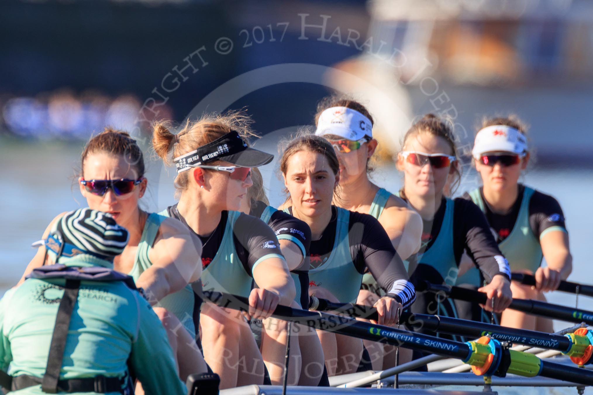 The Women's Boat Race season 2018 - fixture CUWBC vs. ULBC: CUWBC getting ready for the race - 6 Anne Beenken, 7 Imogen Grant, stroke Tricia Smith, cox Sophie Shapter.