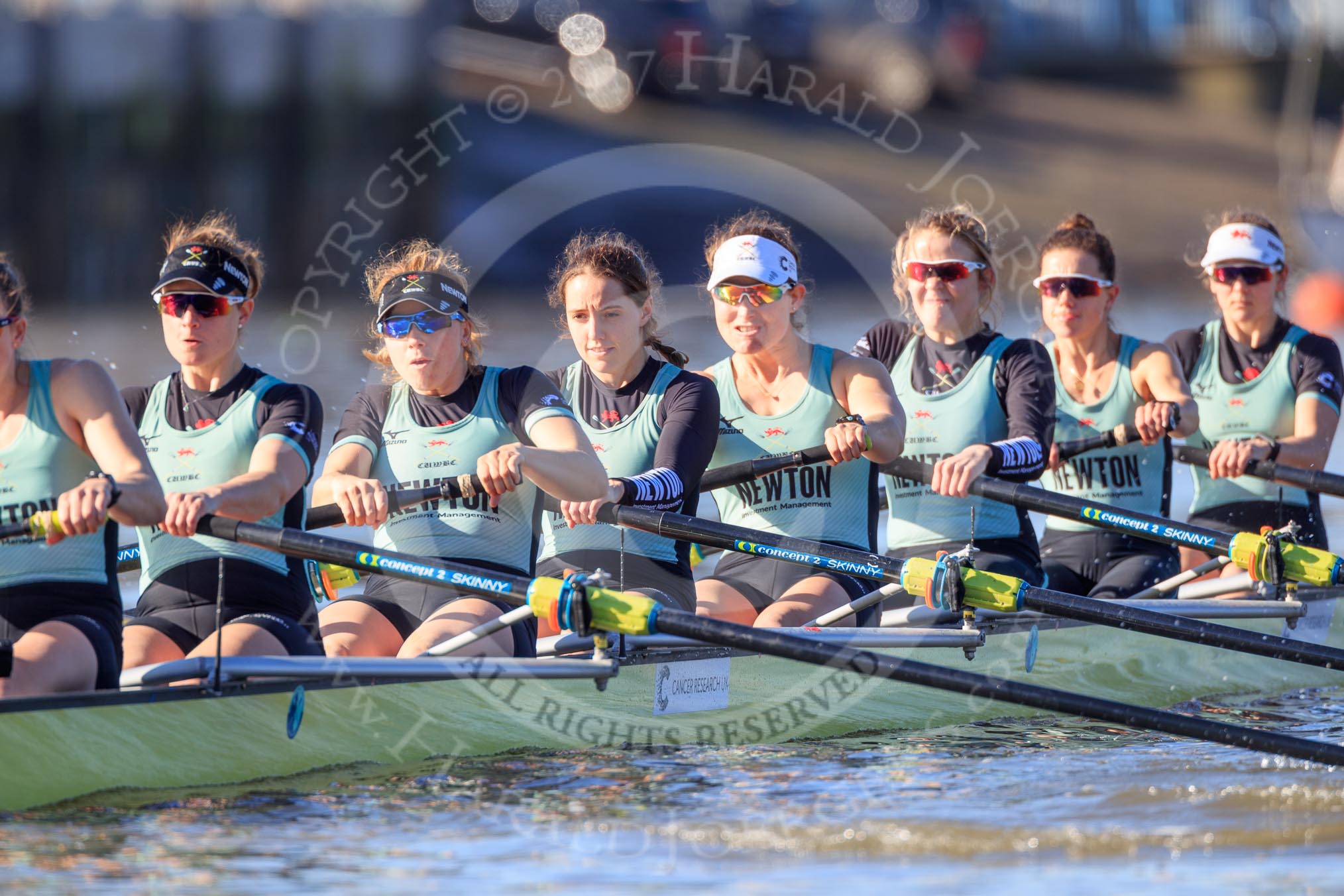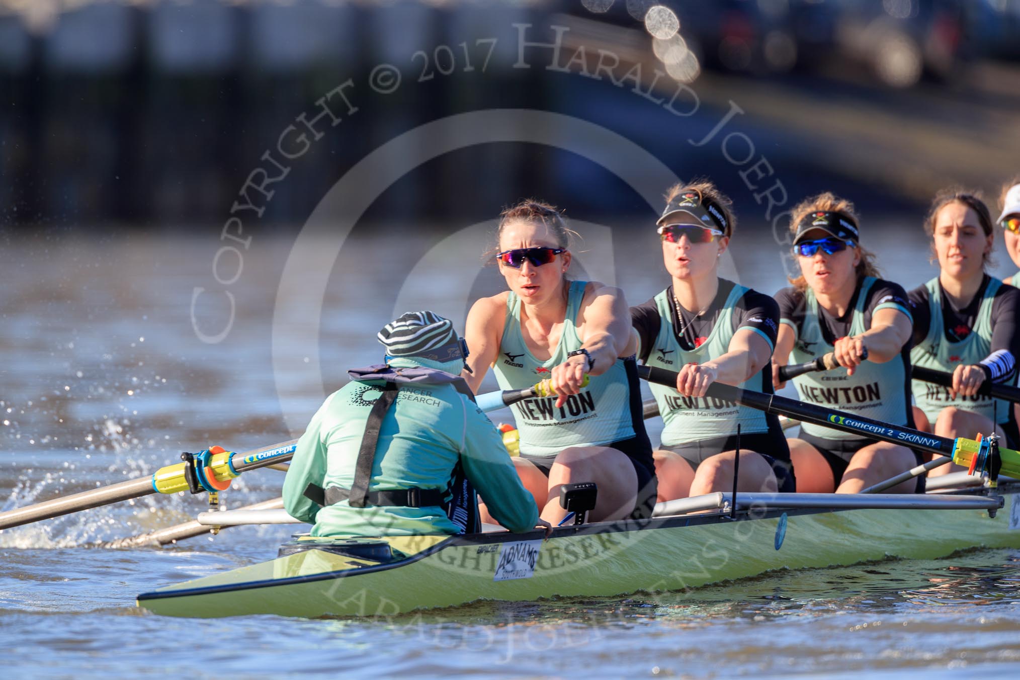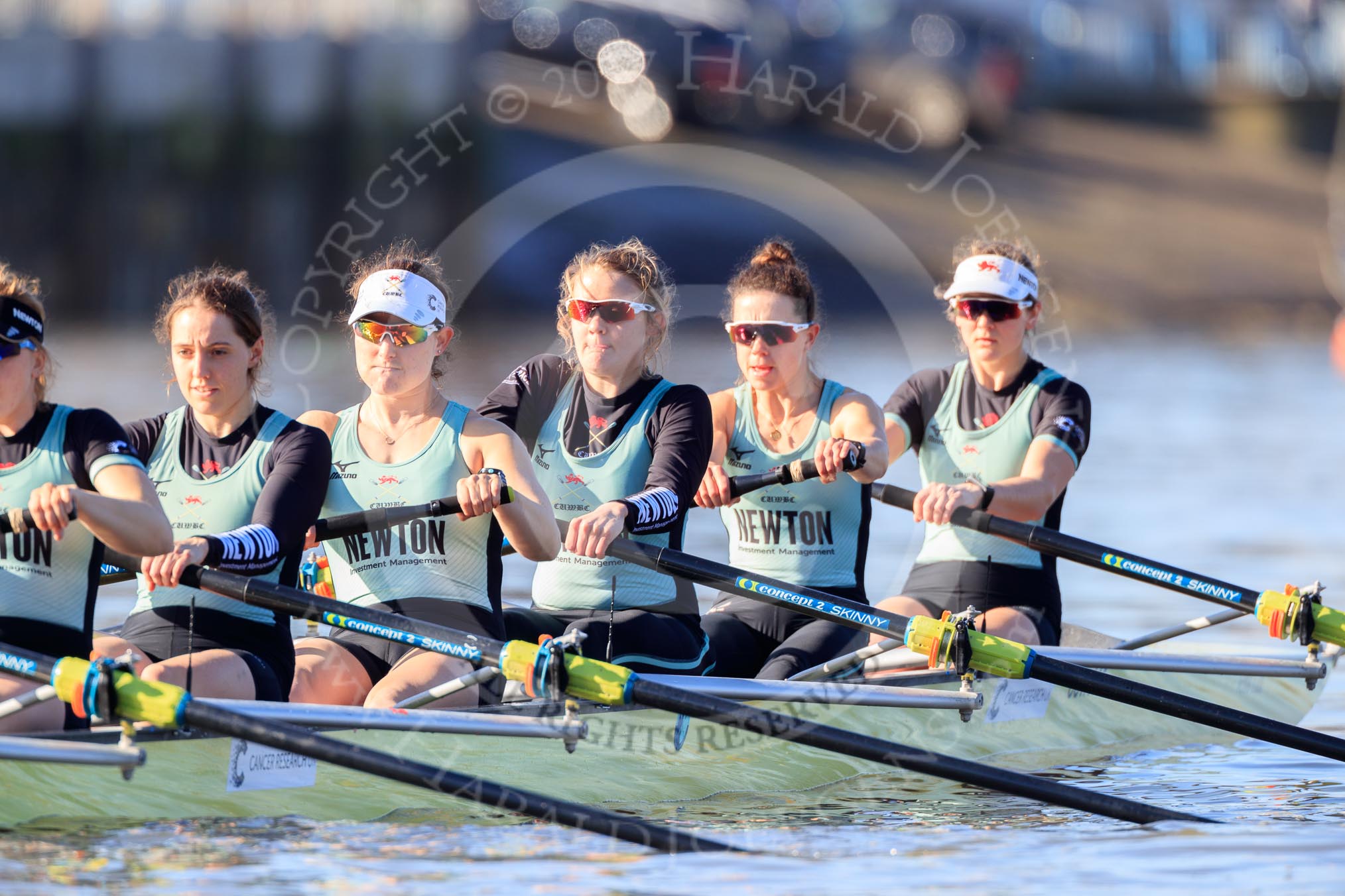 The Women's Boat Race season 2018 - fixture CUWBC vs. ULBC: The race has been started - CUWBC with 6 Anne Beenken, 5 Thea Zabell, 4 Paula Wesselmann, 3 Alice White, 2 Myriam Goudet-Boukhatmi, bow Olivia Coffey.