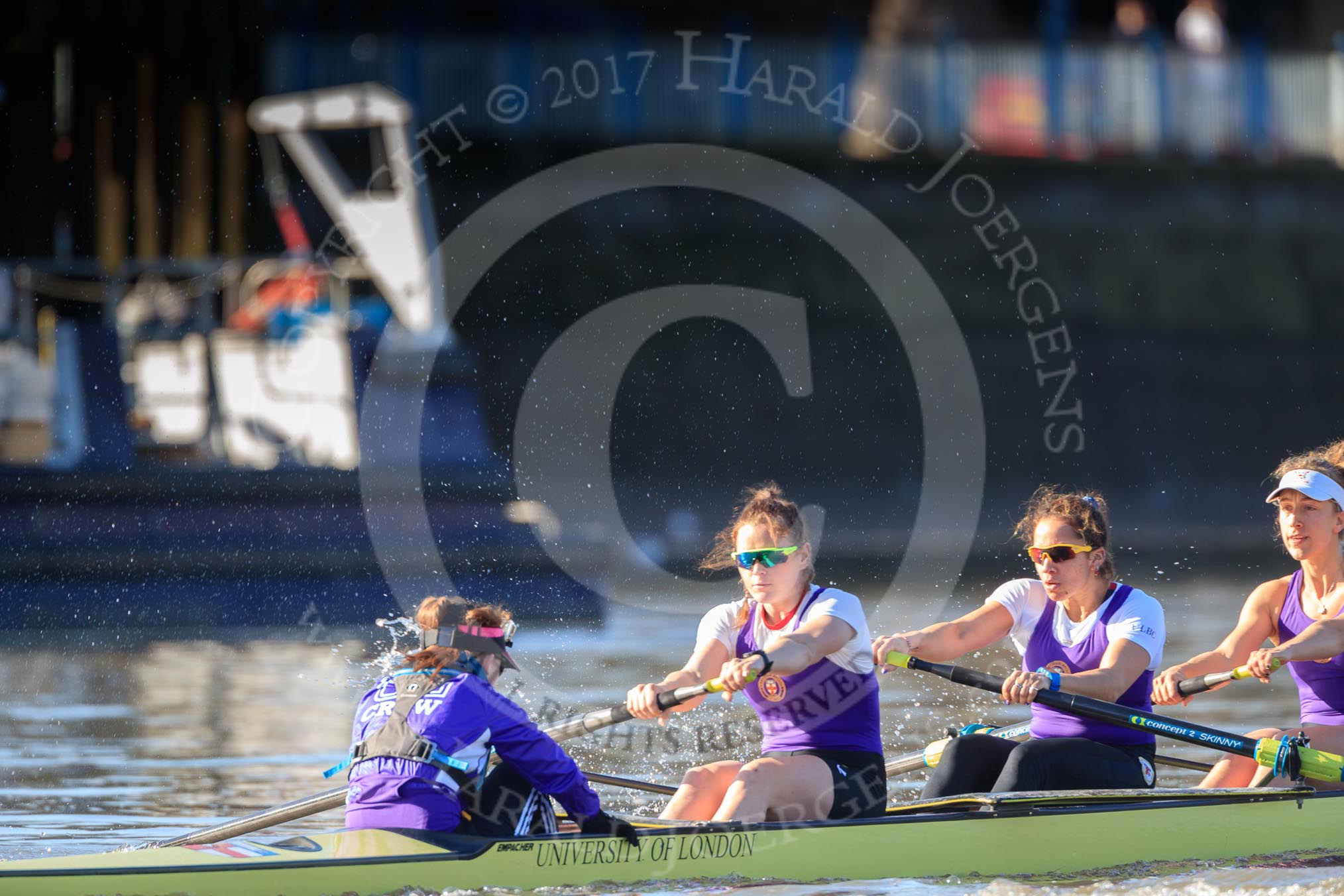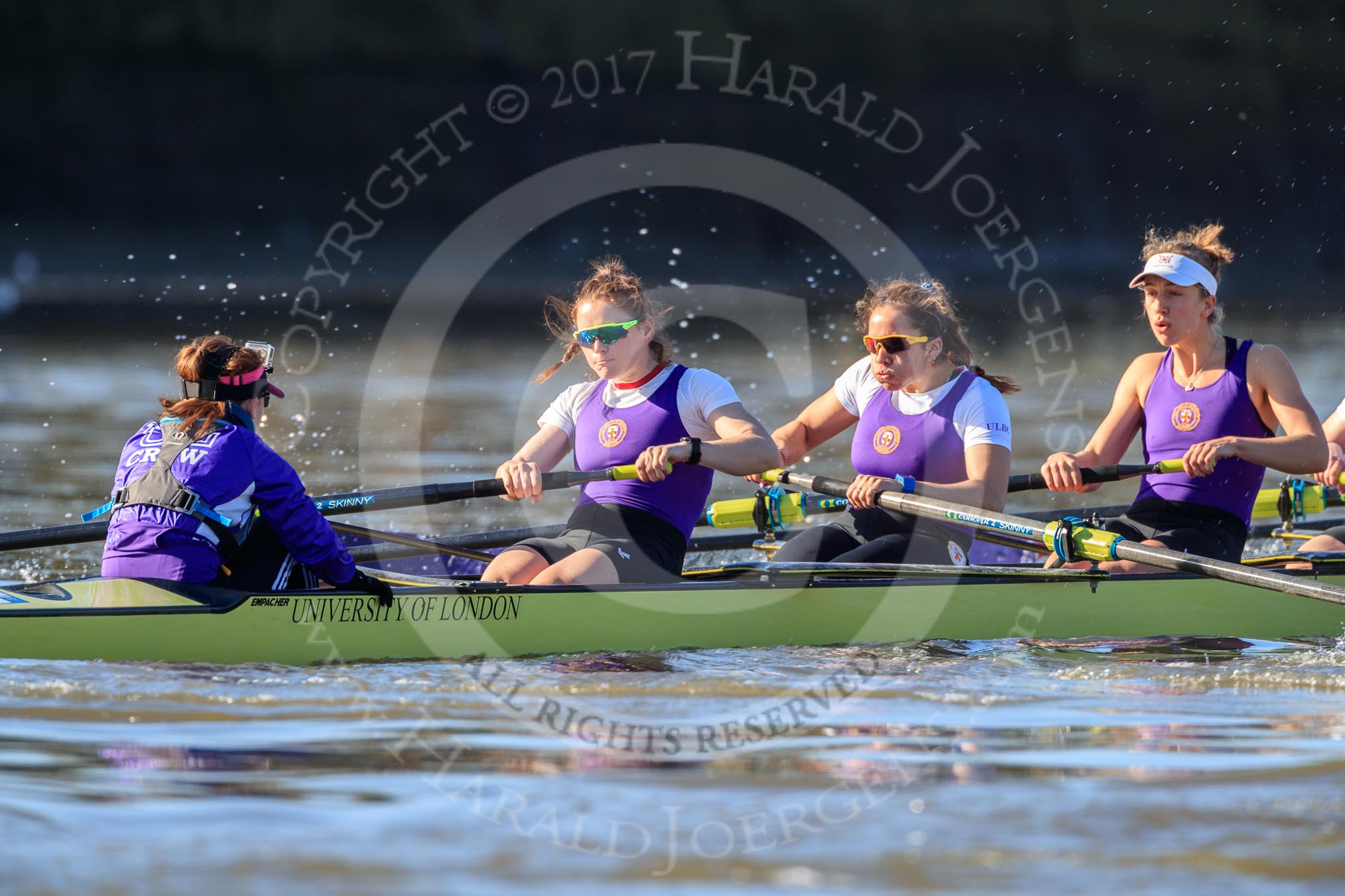 The Women's Boat Race season 2018 - fixture CUWBC vs. ULBC: The race has been started - ULBC with cox Lauren Holland, stroke Issy Powel, 7 Jordan Cole-Huissan, 6 Oonagh Cousins.