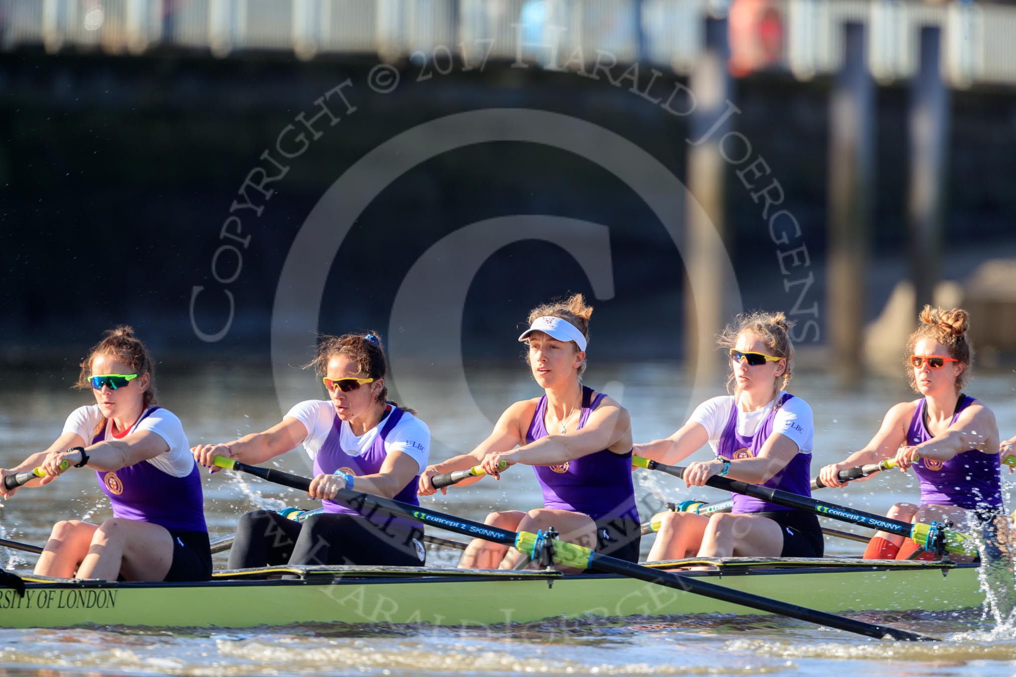 The Women's Boat Race season 2018 - fixture CUWBC vs. ULBC: The race has been started - ULBC with cox Lauren Holland, stroke Issy Powel, 7 Jordan Cole-Huissan, 6 Oonagh Cousins, 5 Hannah Roberts, 4 Katherine Barnhill.