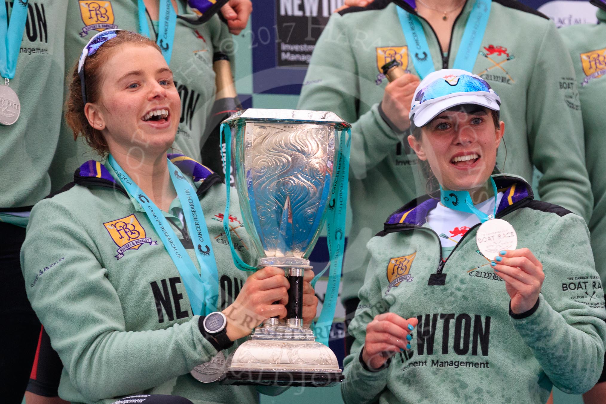 The Cancer Research UK Women's Boat Race 2018: The Cambridge women celebrating with their Boat Race medals, the Women's Boat Race trophy, and lots of Chapel Down Brut: Here Alice White, and Sophie Shapter.