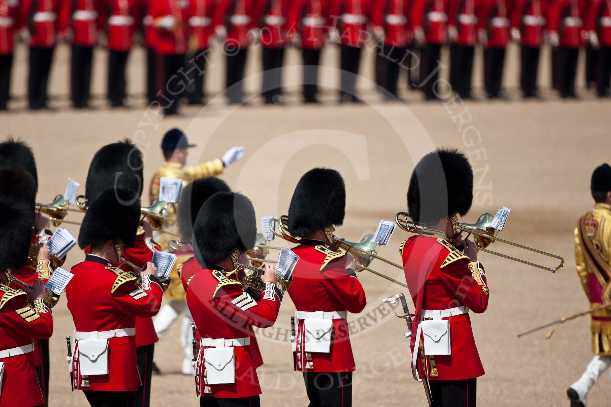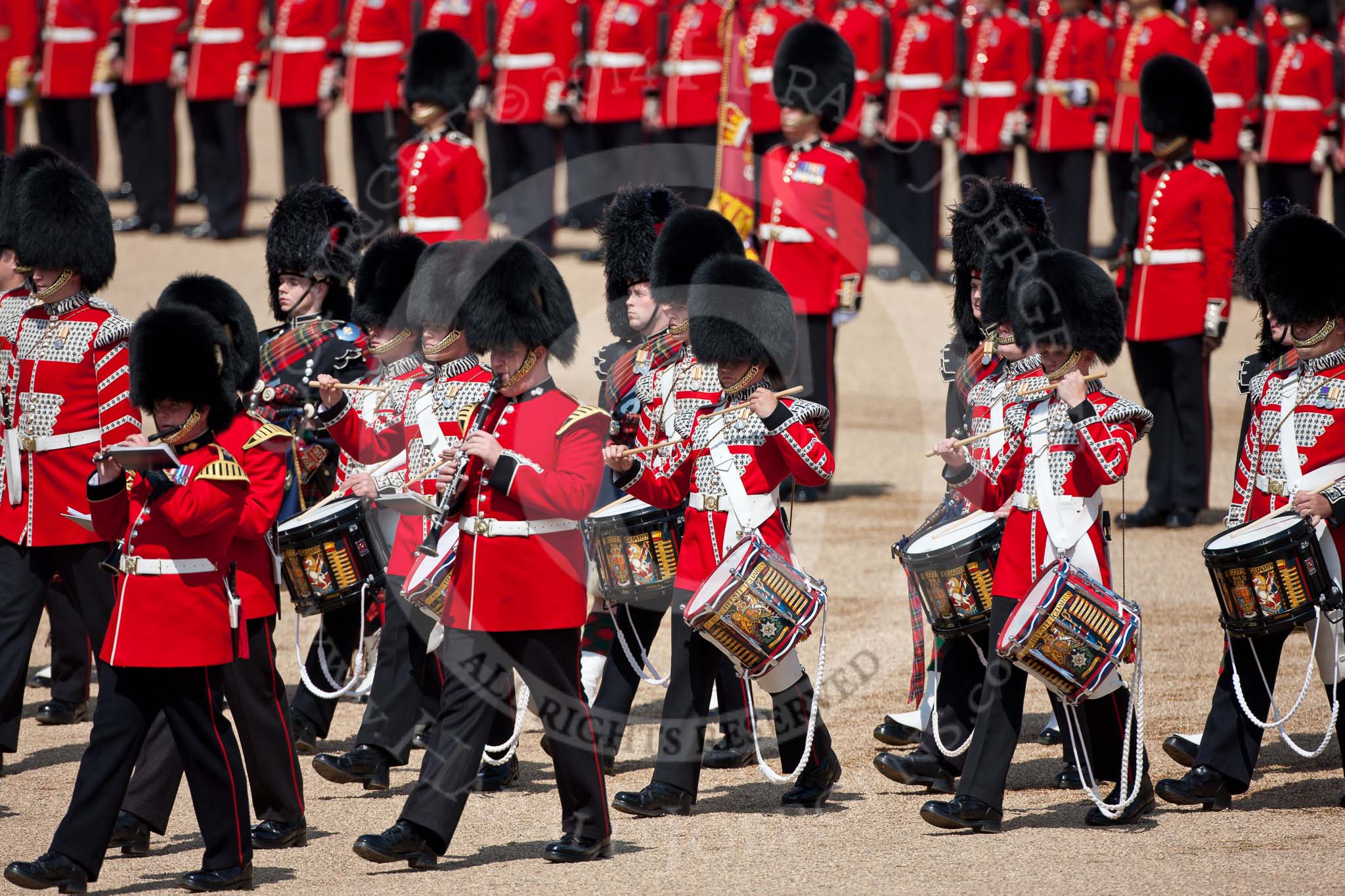 Trooping the Colour 2009: The Massed Bands playing, here Pipers of the Irish Guards behind the Drummers. In the background the Colour Party.. Horse Guards Parade, Westminster, London SW1, United Kingdom, on 13 June 2009 at 11:11, image #169