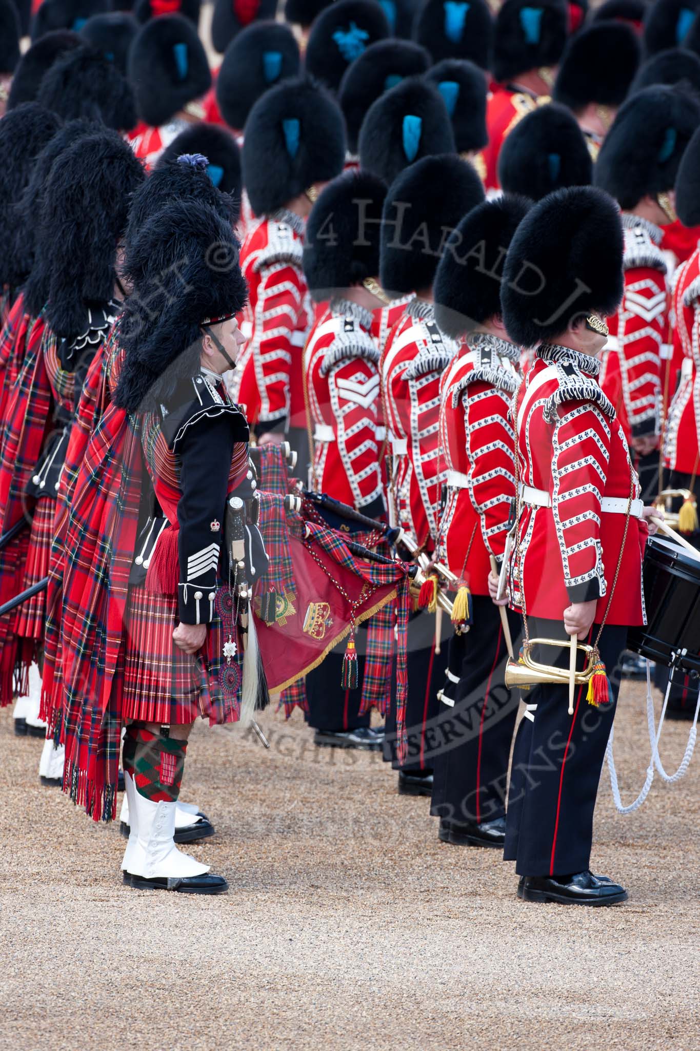 Trooping the Colour 2009: The Massed Bands, here the Drummers and Scots Guard Pipers. On the very left Pipe Major Brian Heriot.. Horse Guards Parade, Westminster, London SW1, United Kingdom, on 13 June 2009 at 11:15, image #173