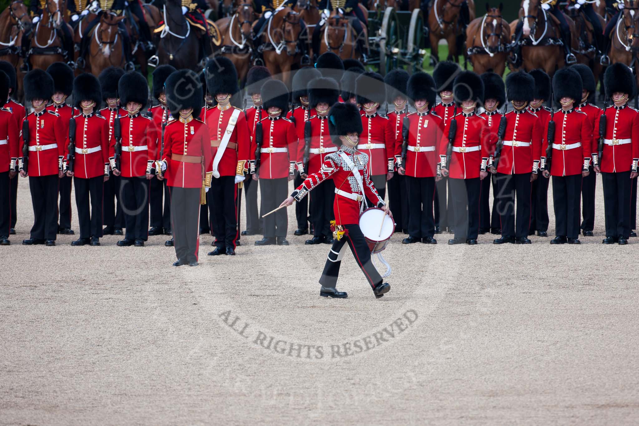 Trooping the Colour 2009: The Lone Drummer. Lance Corporal John Smiley, is breaking the line to perform the Drummers Call. Behind, with the white colour belt, the Ensign, 2nd Lieutenant Andrew Campbell.. Horse Guards Parade, Westminster, London SW1, United Kingdom, on 13 June 2009 at 11:15, image #174
