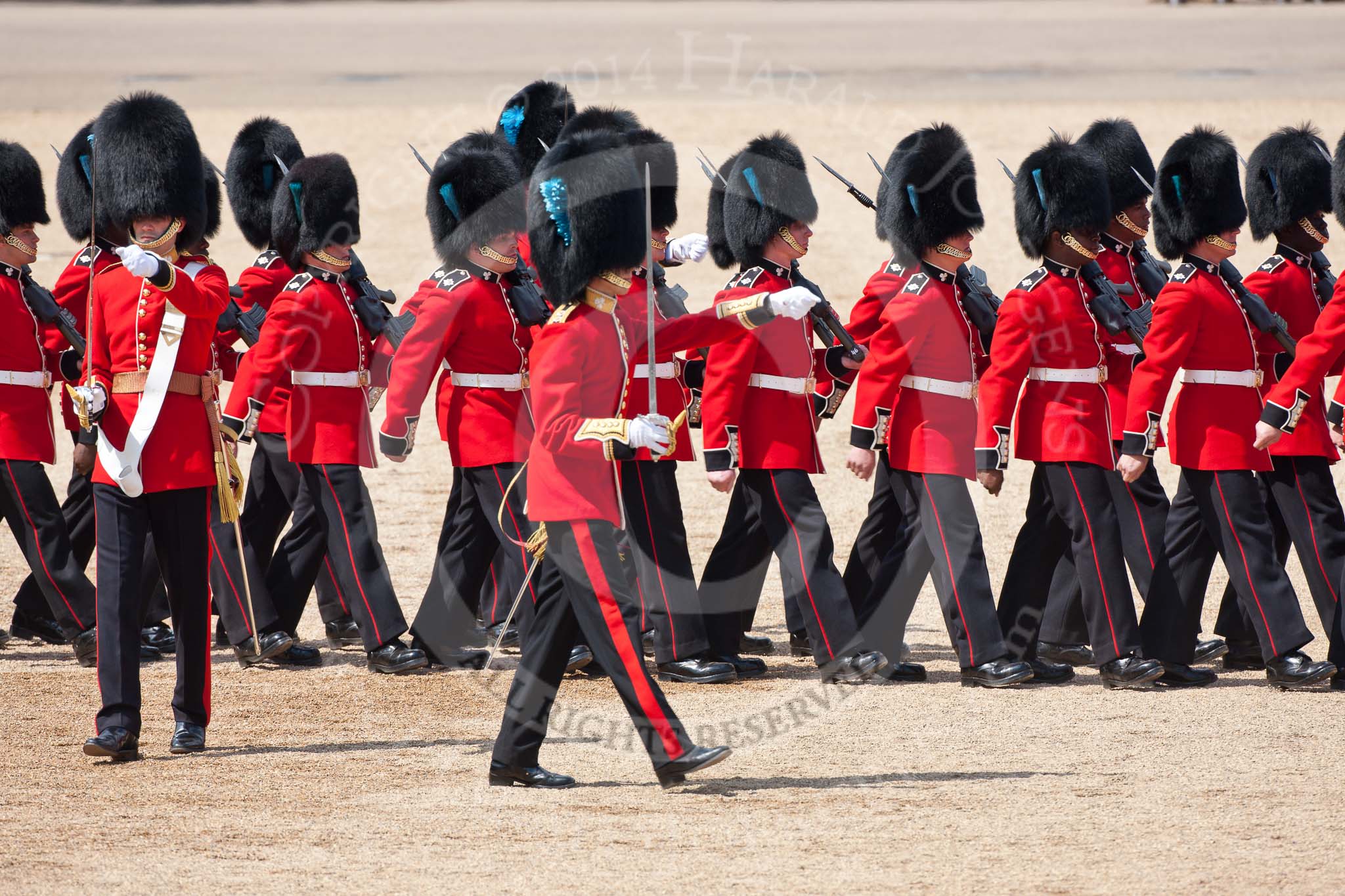 Trooping the Colour 2009: The Escort to the Colour marching forward. In the centre, commanding, Lieutenant P S G O'Gorman, on the left, with the white colour belt, the Ensign, 2nd Lieutenant Andrew Campbell.. Horse Guards Parade, Westminster, London SW1, United Kingdom, on 13 June 2009 at 11:17, image #178