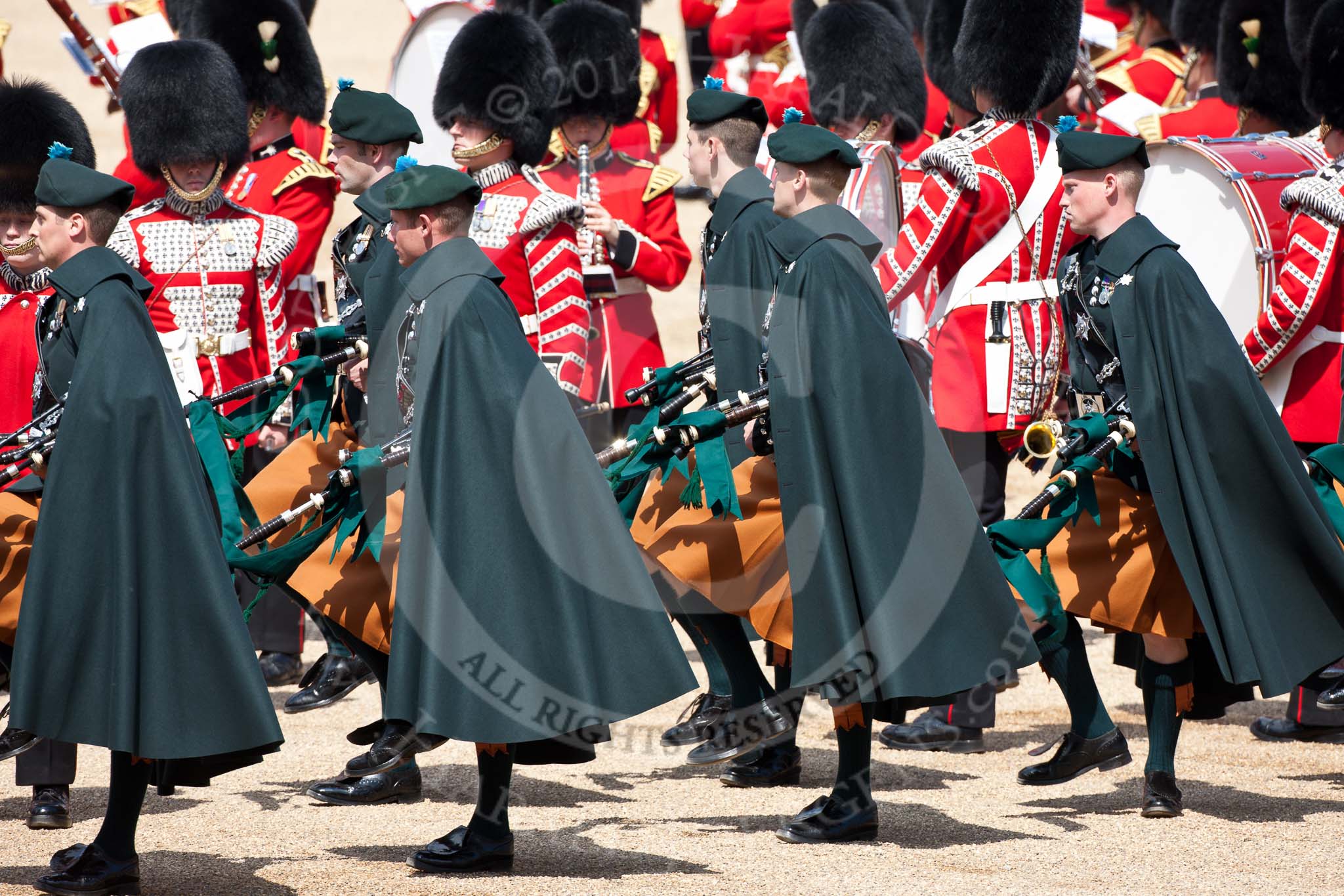 Trooping the Colour 2009: Irish Guards Pipers in their bottle green tunics and saffron coloured kilts with a bottle green cape, in front of Drummers.. Horse Guards Parade, Westminster, London SW1, United Kingdom, on 13 June 2009 at 11:17, image #179