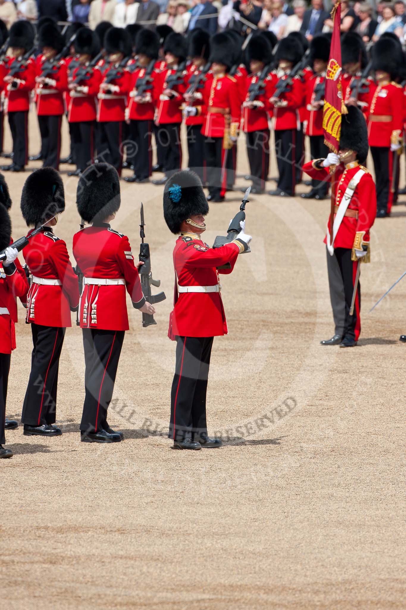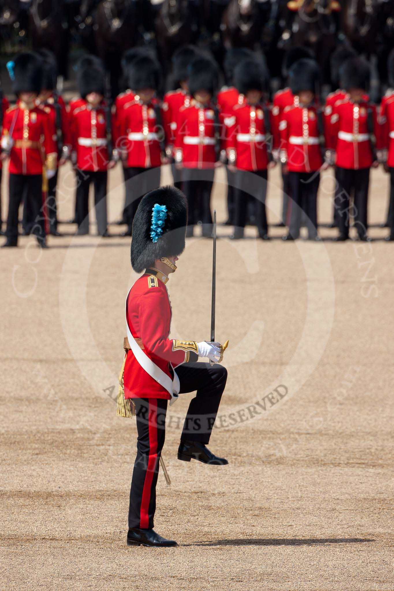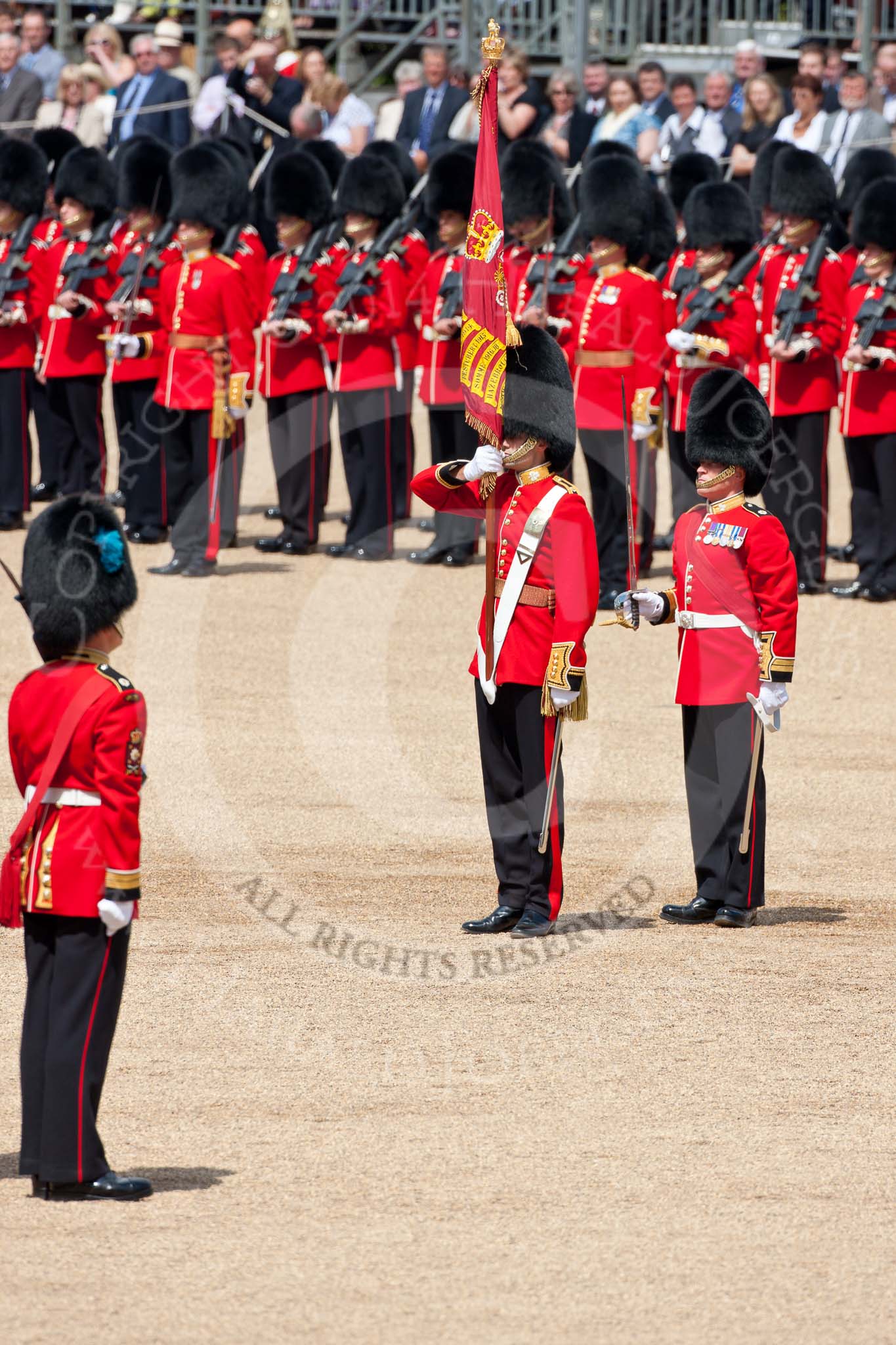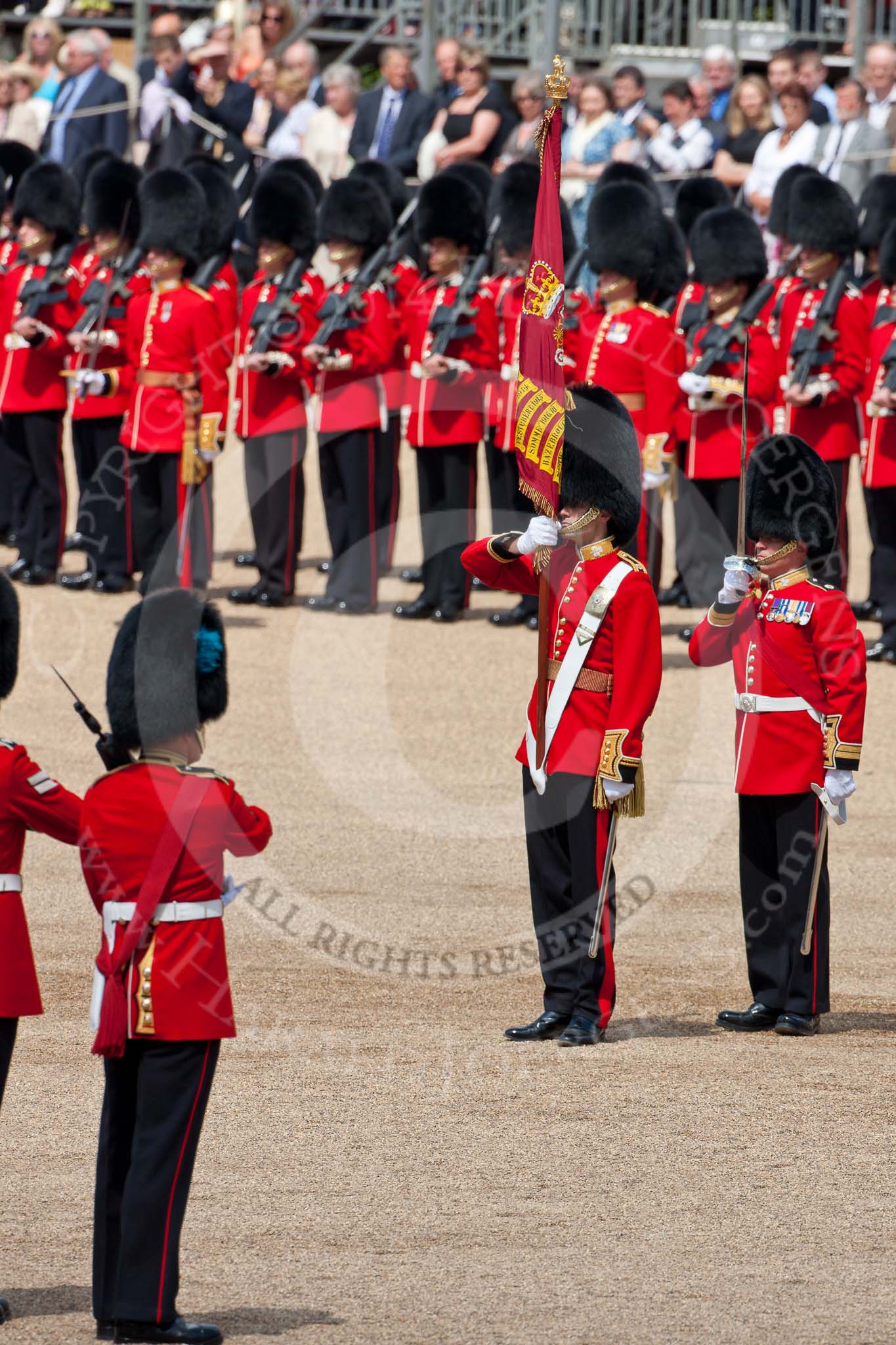 Trooping the Colour 2009: The Escort For the Colour has now become the Escort to the Colour. With the Colour, the Ensign, 2nd Lieutenant Andrew Campbell, on his left the Regimental Sergeant Major, WO1 Ross Martin.. Horse Guards Parade, Westminster, London SW1, United Kingdom, on 13 June 2009 at 11:21, image #188
