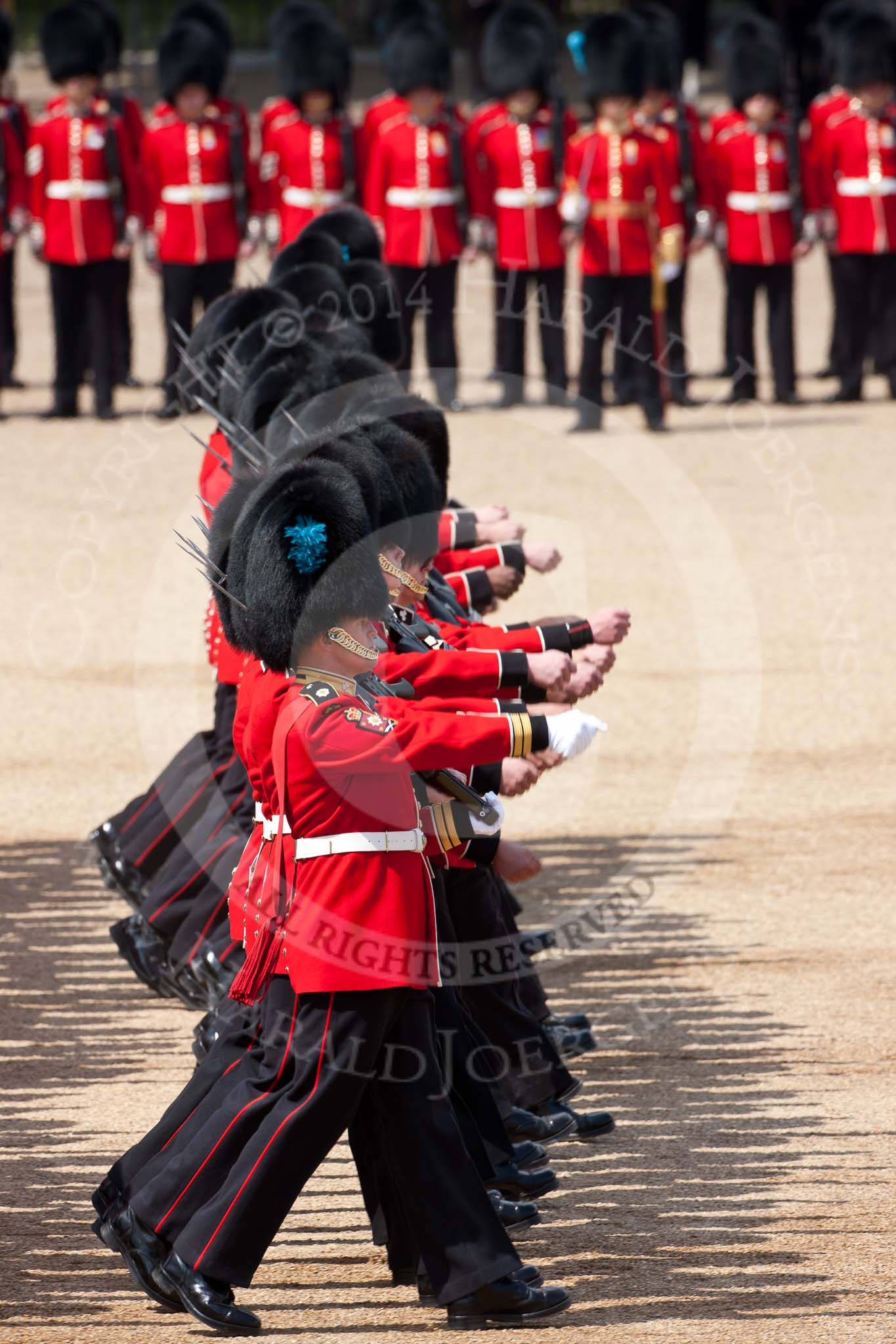 Trooping the Colour 2009: No. 1 Guard, 1st Battalion Irish Guards, the Escort for the Colour, is marching foreward to take posession of the Colour.. Horse Guards Parade, Westminster, London SW1, United Kingdom, on 13 June 2009 at 11:18, image #182