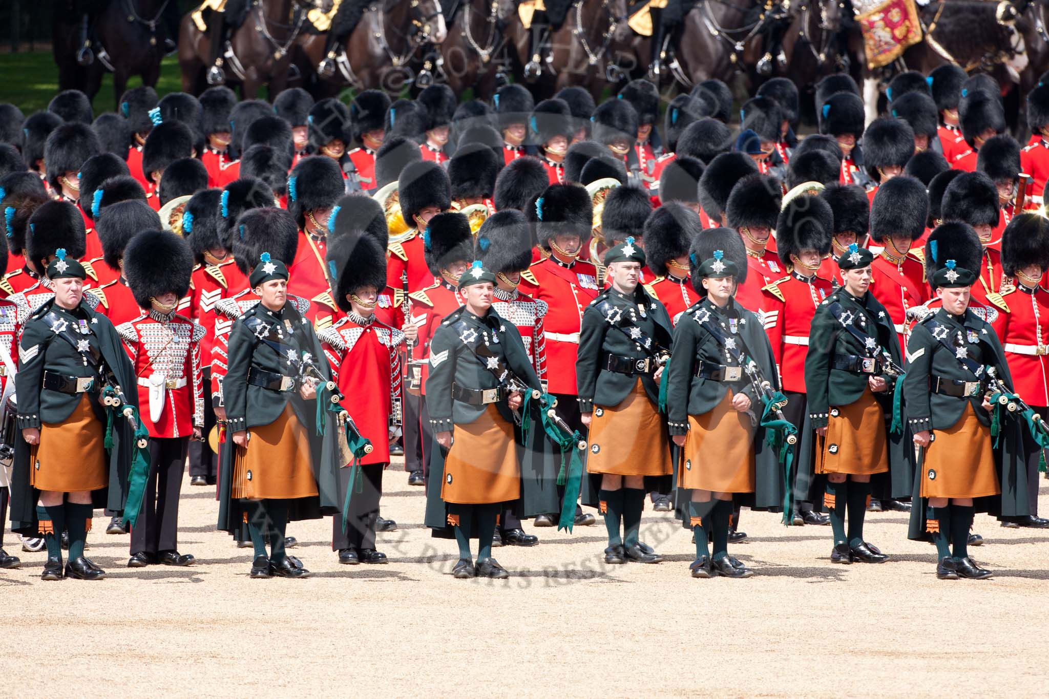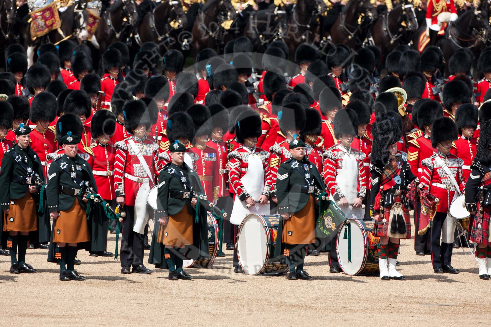 Trooping the Colour 2009: The Massed Bands, here Irish Guard Pipers and Drummers in front, during the Collection of the Colour.. Horse Guards Parade, Westminster, London SW1, United Kingdom, on 13 June 2009 at 11:21, image #185