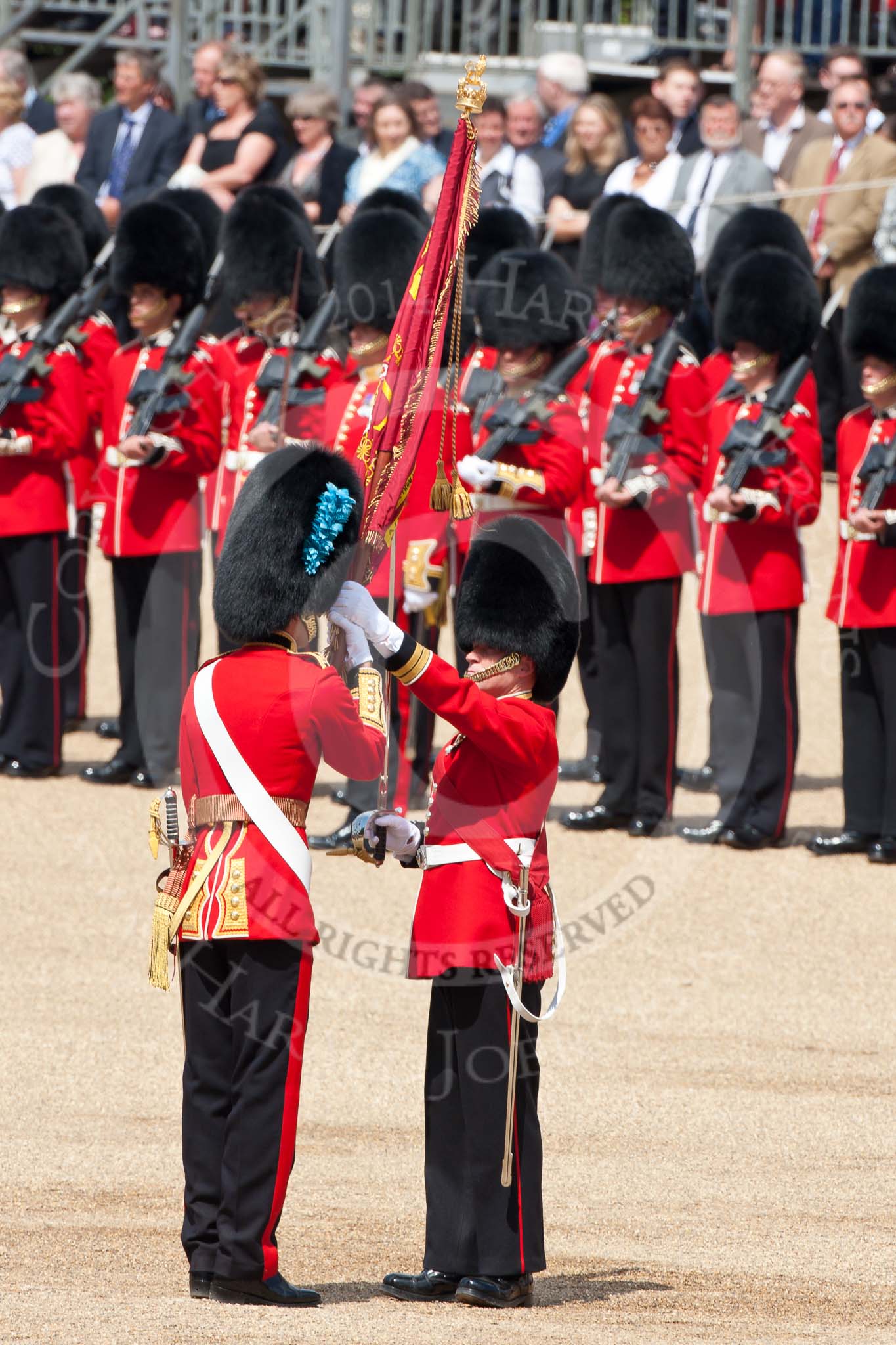 Trooping the Colour 2009: The Regimental Sergeant Major, WO1 Ross Martin, is handing over the Colour to the Ensign, 2nd Lieutenant Andrew Campbell, by placing it into his colour belt.. Horse Guards Parade, Westminster, London SW1, United Kingdom, on 13 June 2009 at 11:21, image #187