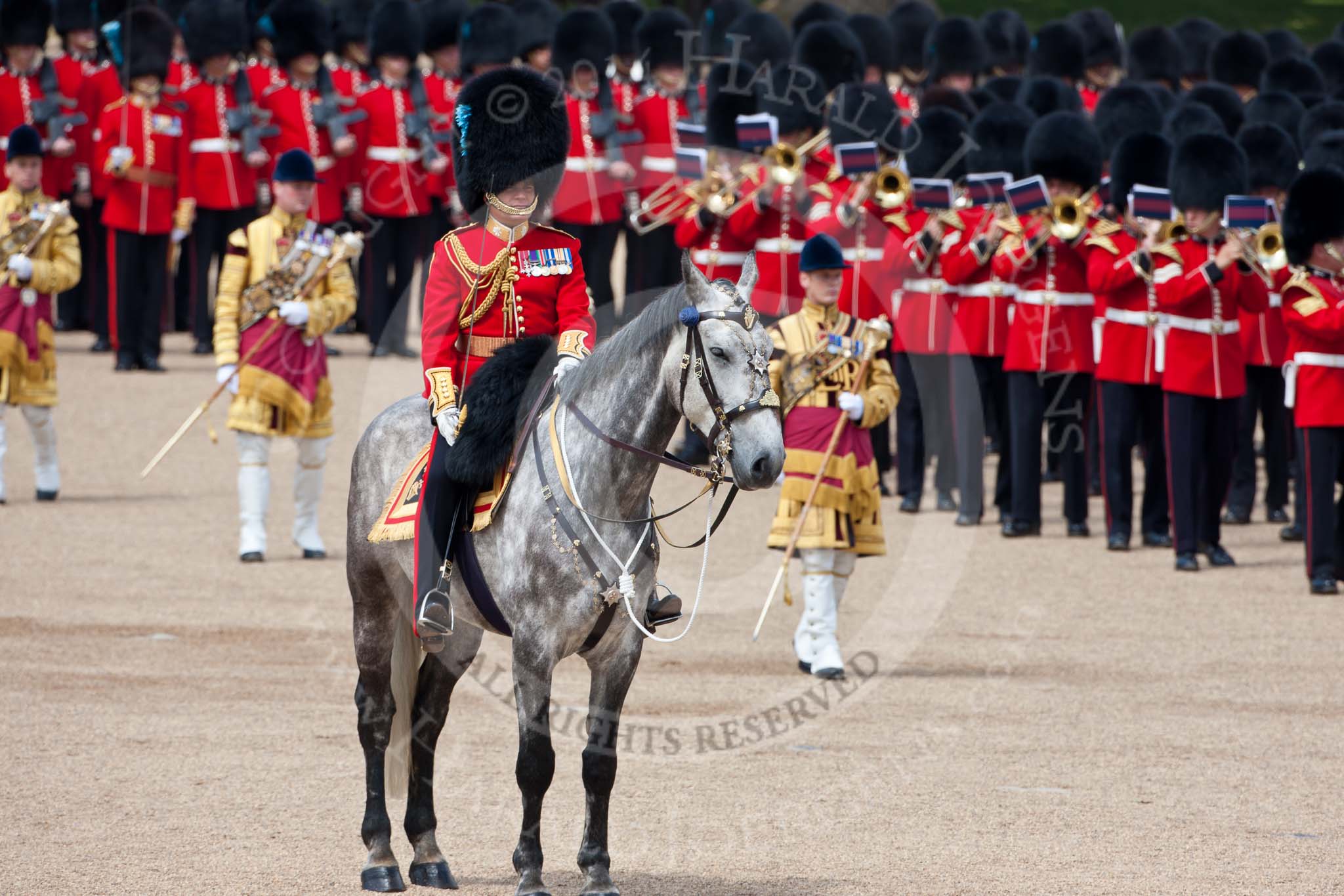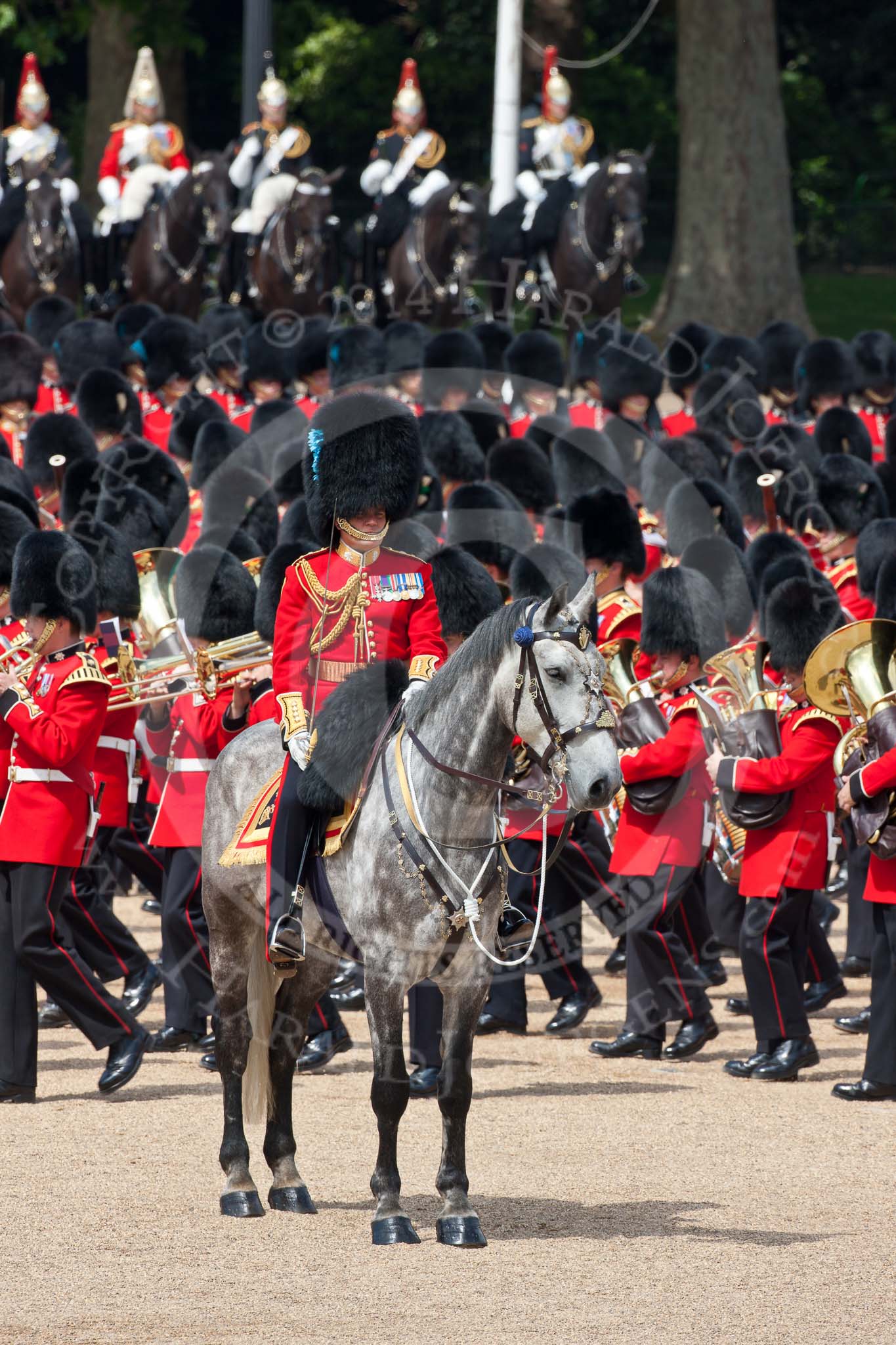 Trooping the Colour 2009: The Field Officer in Brigade Waiting, Lieutenant Colonel B C Farrell, on 'Wellesley', behind him the Massed Bands marching.. Horse Guards Parade, Westminster, London SW1, United Kingdom, on 13 June 2009 at 11:23, image #193