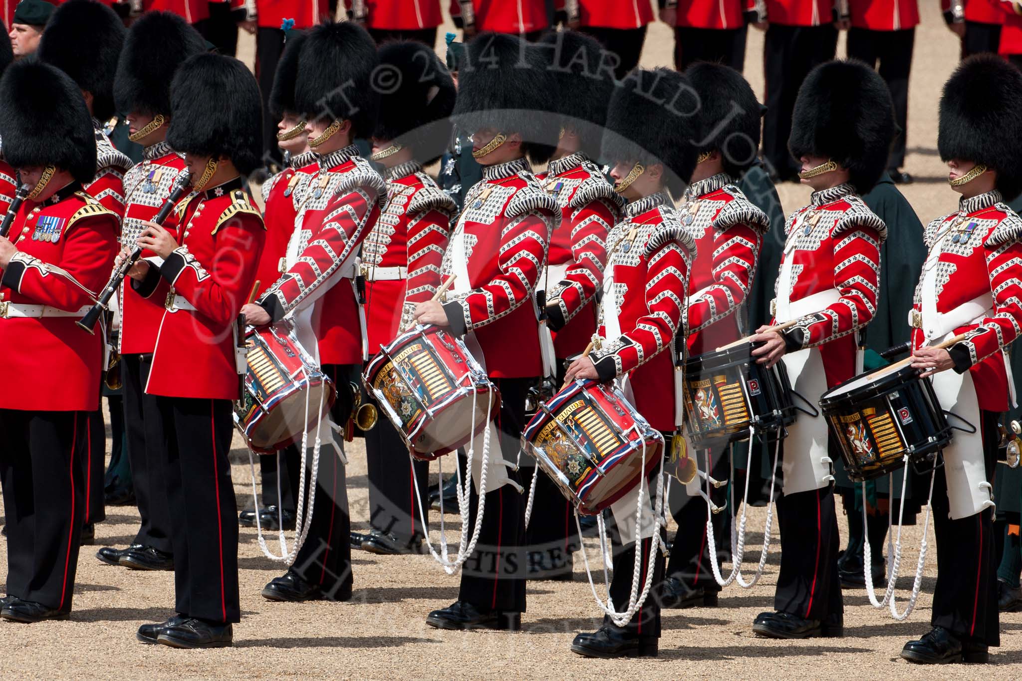 Trooping the Colour 2009: The Band of the Coldstrea Guards on on the left, and the Drummers of the Band of the Irish Guards, with their colourful drums, on the right.. Horse Guards Parade, Westminster, London SW1, United Kingdom, on 13 June 2009 at 11:24, image #194