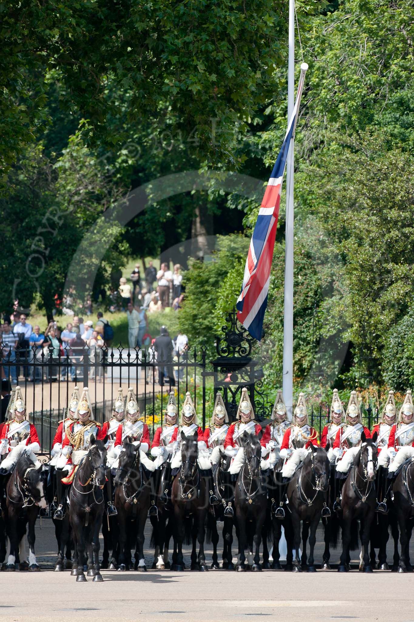 Trooping the Colour 2009: The Life Guards in front of St. James's Park, with the Union Jack flying above them..
