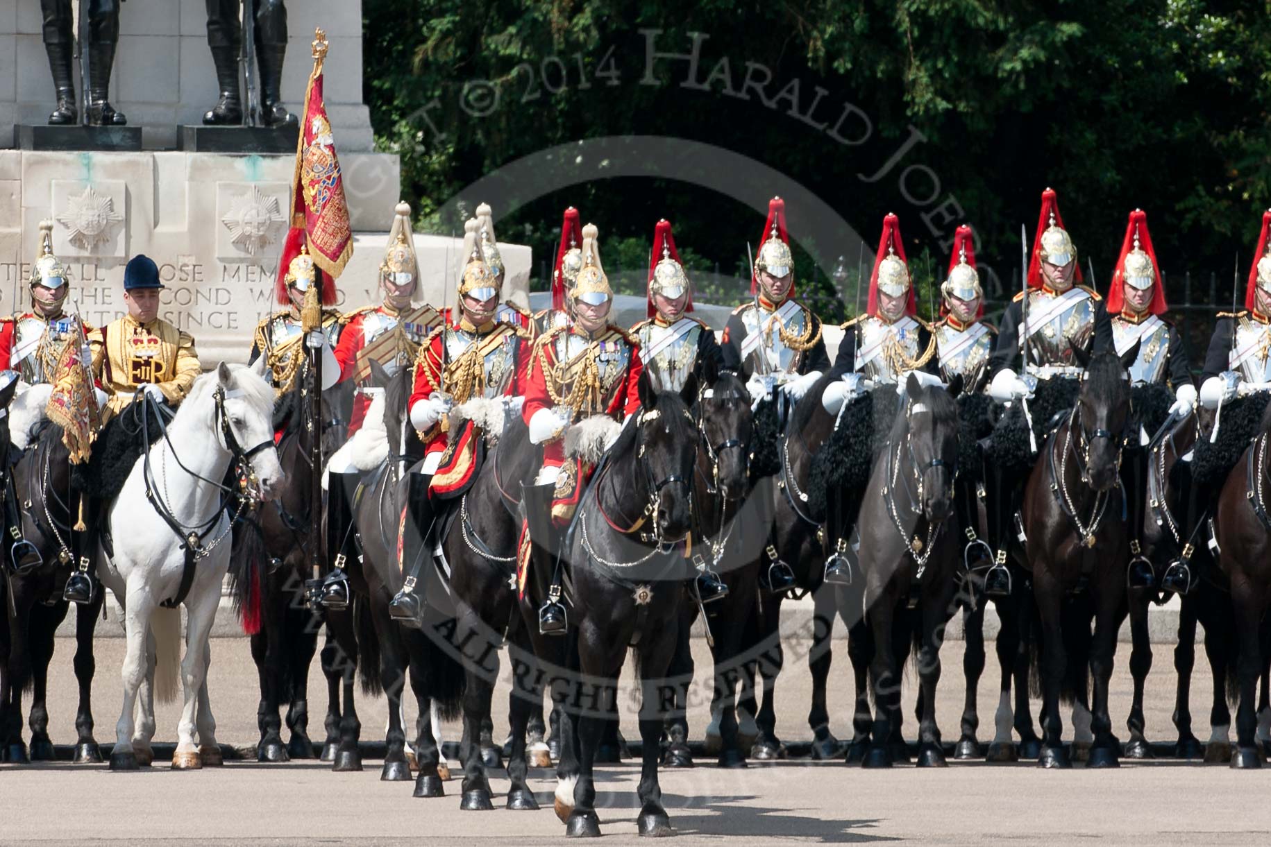 Trooping the Colour 2009: Trumpeter, Standard Bearer, Standard Coverer, and officers and troopers from The Life Guards and The Blues and Royals in front of the Guards Memorial..