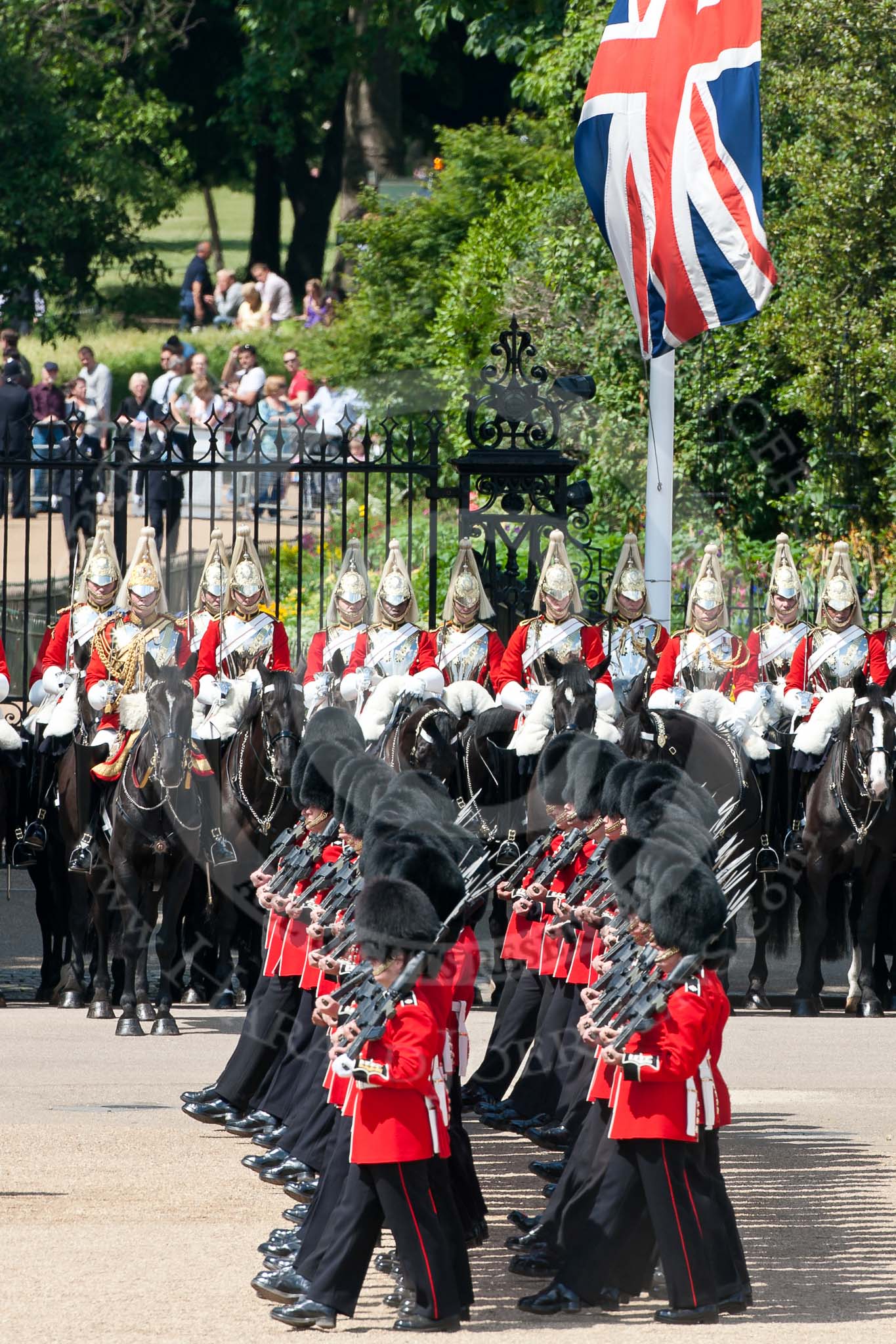 Trooping the Colour 2009: The March Past - guardsmen marching along the line of Life Guards, Household Cavalry, on the St. James's Park side of Horse Guards Parade..