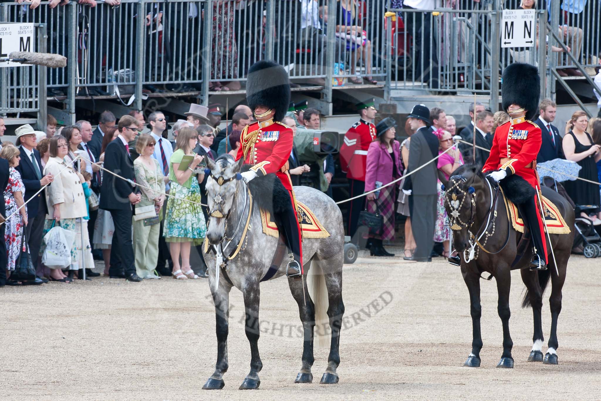 Trooping the Colour 2009: The Field Officer, Lieutenant Colonel Ben Farrell, Irish Guards, riding 'Wellesley', on the left, and The Major of the Parade, Major F A D L Roberts, Irish Guards, on the right..