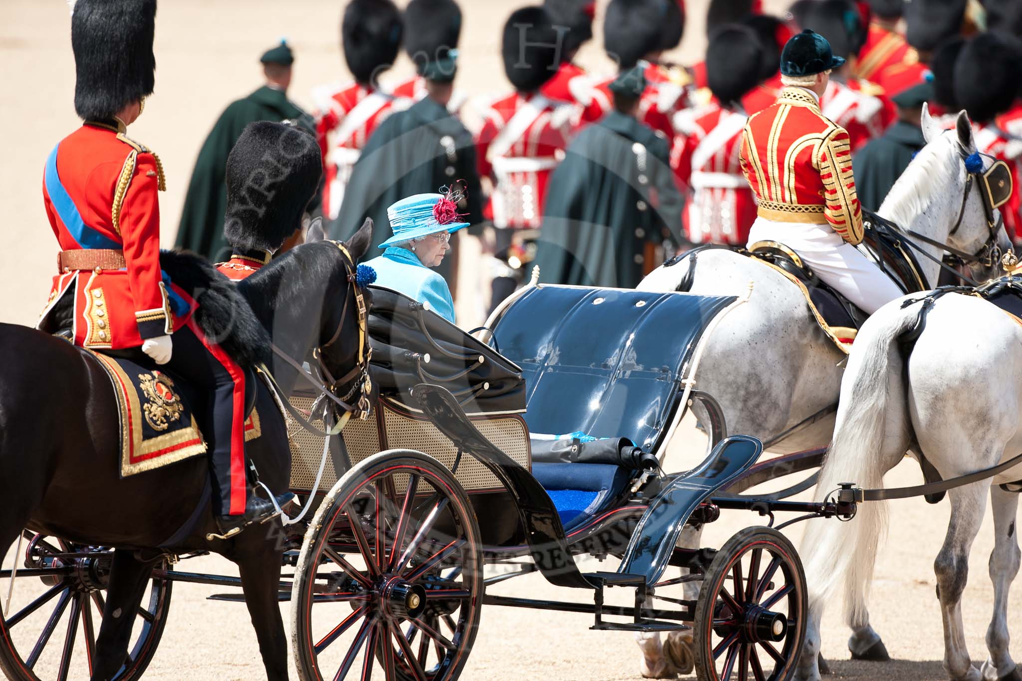 Trooping the Colour 2009: March Off - the ivory mounted phaeton with HM The Queen and HRH Prince Philip, The Duke of Edinburgh, leaving Horse Guards Parade.. Horse Guards Parade, Westminster, London SW1, United Kingdom, on 13 June 2009 at 12:12, image #261