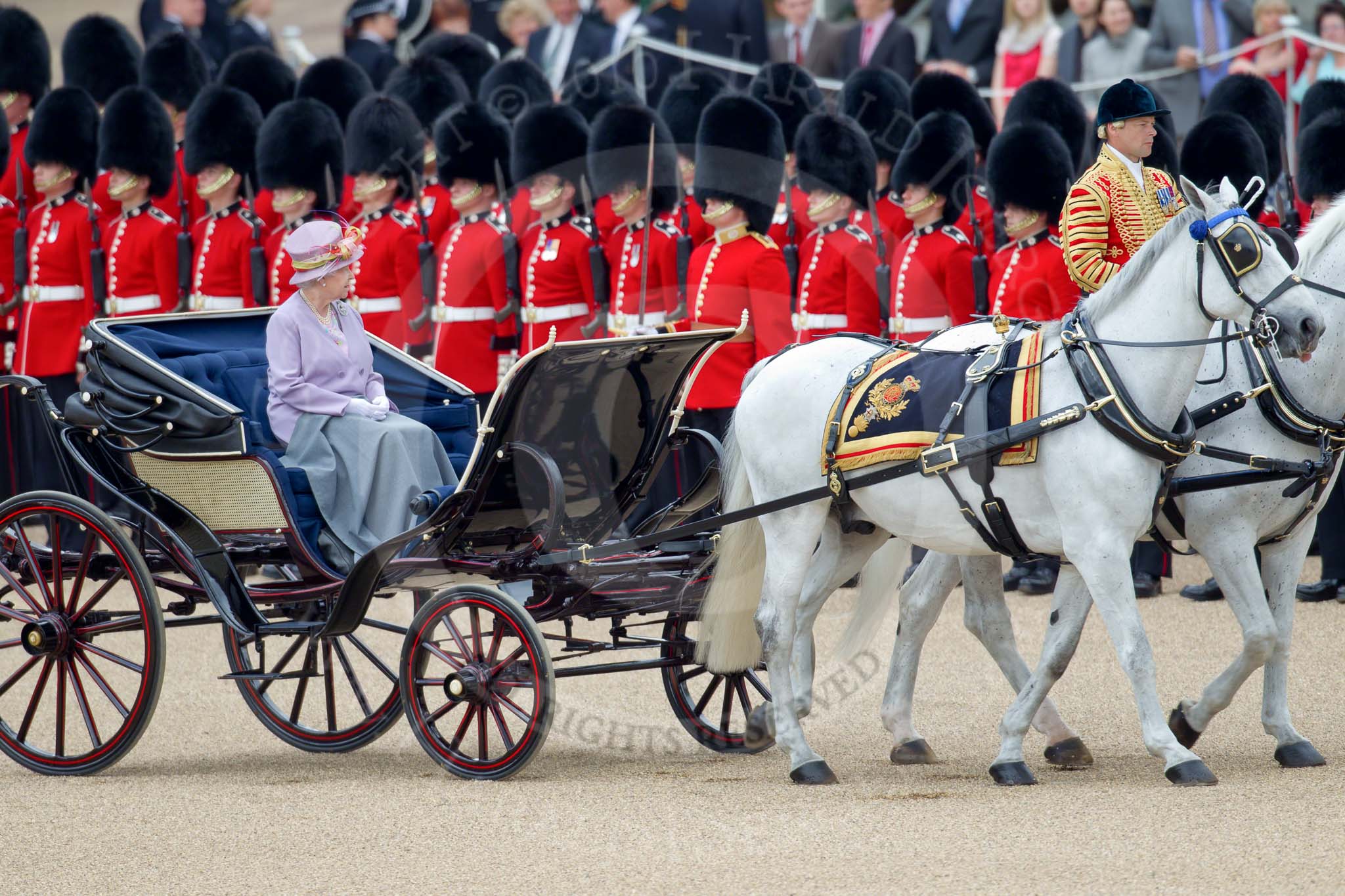 Trooping the Colour 2010: Her Majesty The Queen, sitting in her Ivory Mounted Phaeton, inspecting the line of soldiers on the parade ground. In the background spectators watching from St. James's Park, on the western end of the parade ground, and in the foreground one of the Drum Majors.. Horse Guards Parade, Westminster, London SW1, Greater London, United Kingdom, on 12 June 2010 at 11:06, image #89