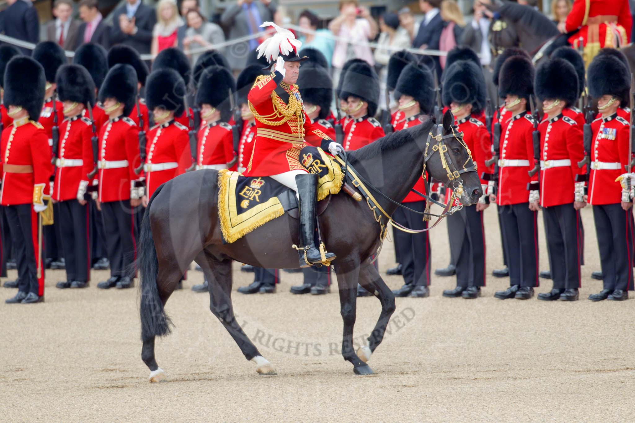Trooping the Colour 2010: Lieutenant Colonel J D Bagshaw, Coldstream Guards, Brigade Major Household Division, and four Troopers of the Blues and Royals, leading the Royal Procession during the inspection of the line. In the background spectators watching from St. James's Park, on the western side of the parade ground, in the front, out of focus, two of the five Drum Majors.. Horse Guards Parade, Westminster, London SW1, Greater London, United Kingdom, on 12 June 2010 at 11:05, image #87