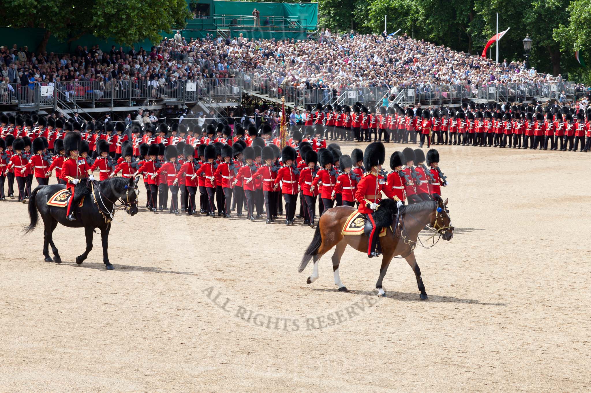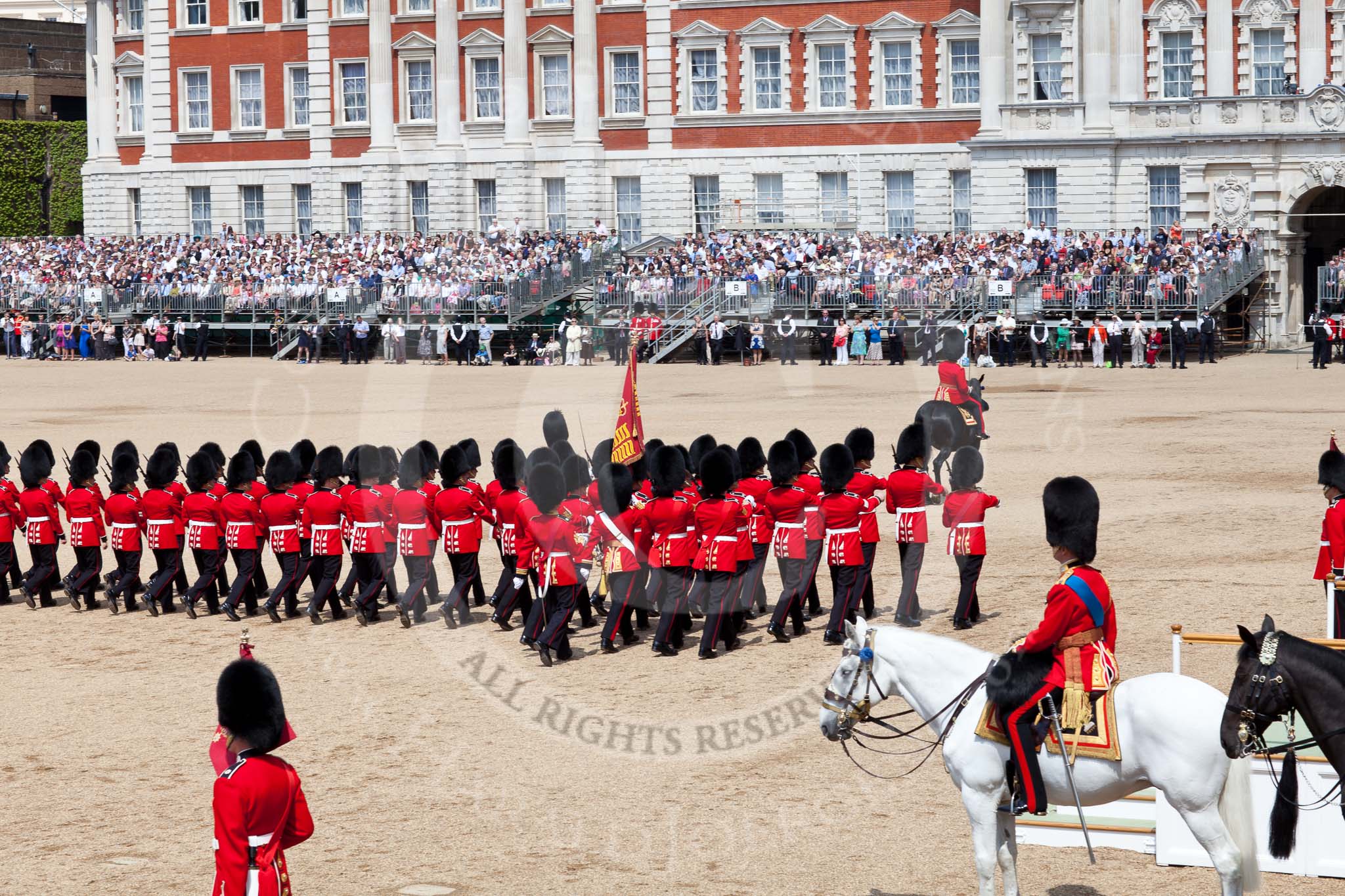 The Colonel's Review 2011: The March Past in quick time. The Field Officer, followed by the Major of the Parade, then the guard divisions, lead by No. 1 Guard, the Escort to the Colour.. Horse Guards Parade, Westminster, London SW1, United Kingdom, on 04 June 2011 at 11:43, image #205