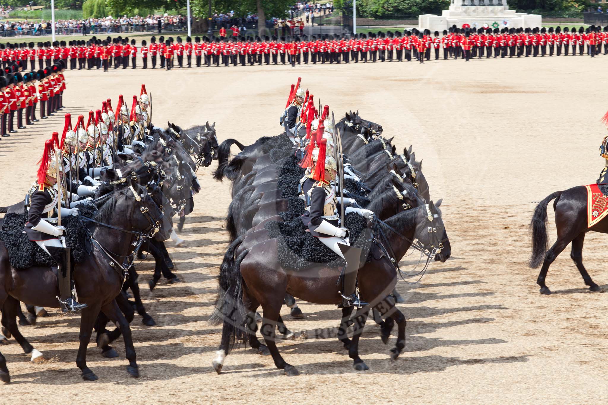 The Colonel's Review 2011: Household Cavalry, here The Blues and Royals, during the Ride Past. Behind them, in the centre of Horse Guards Parade, the Massed Bands.. Horse Guards Parade, Westminster, London SW1, United Kingdom, on 04 June 2011 at 11:54, image #241