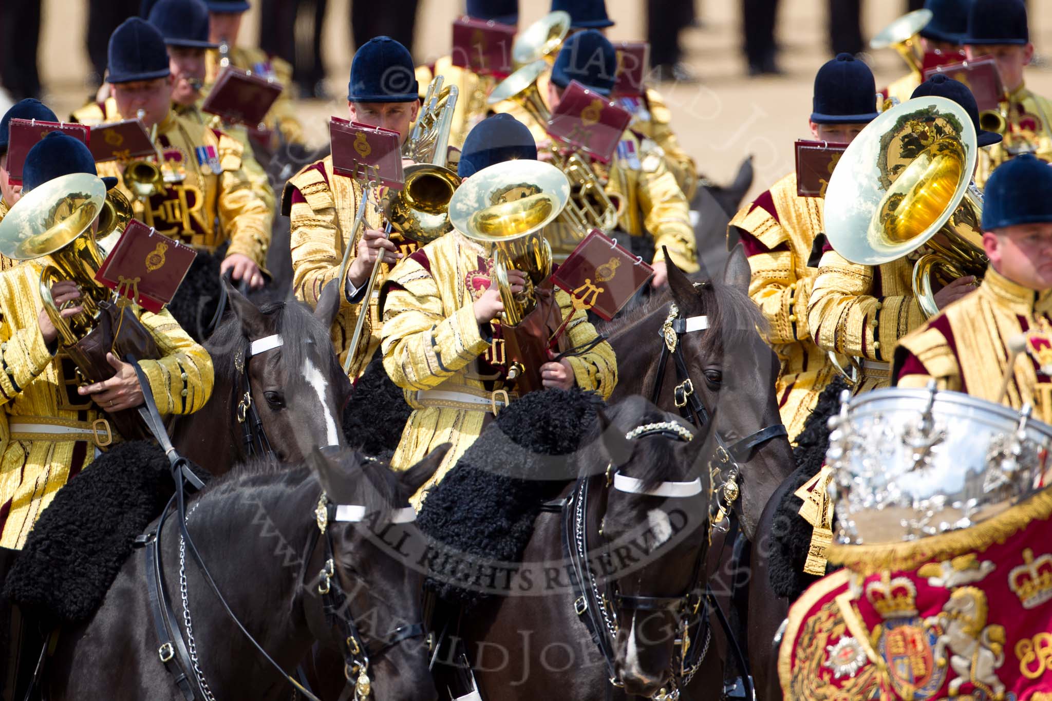 The Colonel's Review 2011: Kettle drummer of the Mounted Band of the Household Cavalry, the musicians around him playing the euphonium and the tuba.. Horse Guards Parade, Westminster, London SW1, United Kingdom, on 04 June 2011 at 11:55, image #246