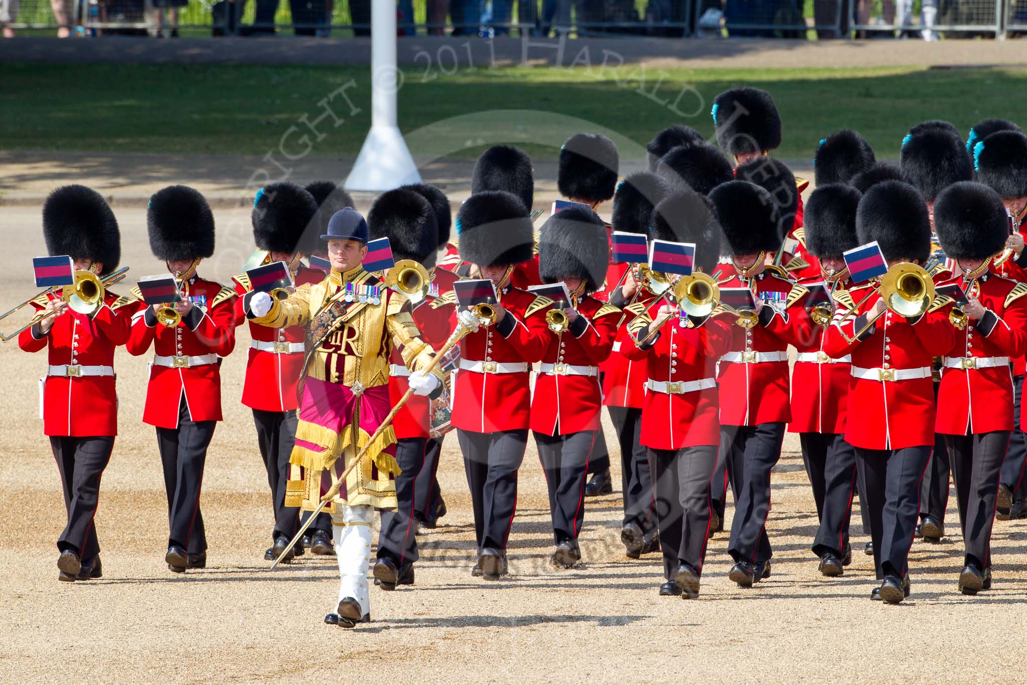 The Colonel's Review 2011: Drum Major Tony Taylor, No. 7 Company Coldstream Guards, with the Band of the Irish Guards arriving on Horse Guards Parade.. Horse Guards Parade, Westminster, London SW1, United Kingdom, on 04 June 2011 at 10:17, image #16