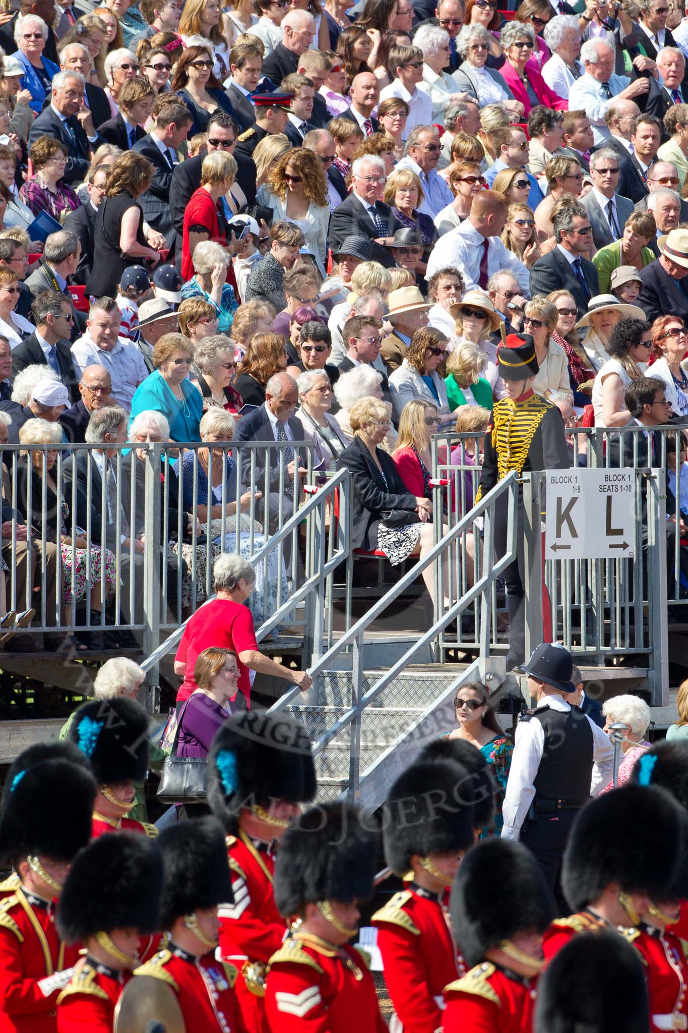 The Colonel's Review 2011: Spectators on a grand stand at the Downing Street side of the parade ground. A member of the Royal Horse Artillery helping spectators to find their seats. In front, the Band of the Irish Guards.. Horse Guards Parade, Westminster, London SW1, United Kingdom, on 04 June 2011 at 10:22, image #20