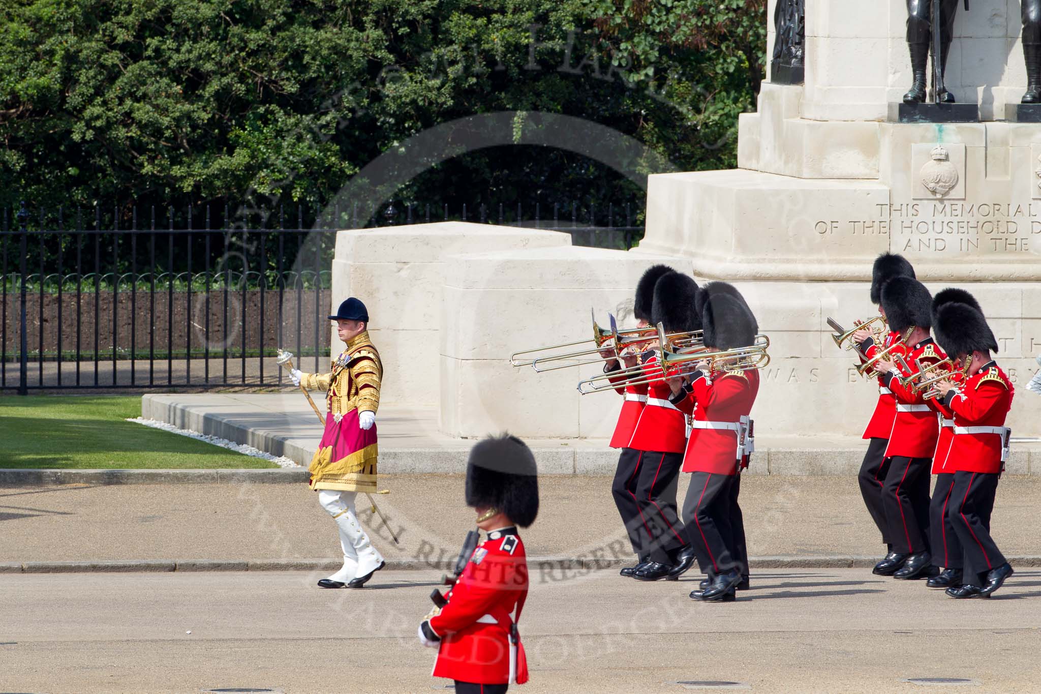 The Colonel's Review 2011: Drum Major Scott Fitzgerald, Coldstream Guards, leading the Band of the Coldstream Guards onto the parade ground, passing the Guards Memorial on the St. James's Park side of the parade ground.. Horse Guards Parade, Westminster, London SW1, United Kingdom, on 04 June 2011 at 10:25, image #22