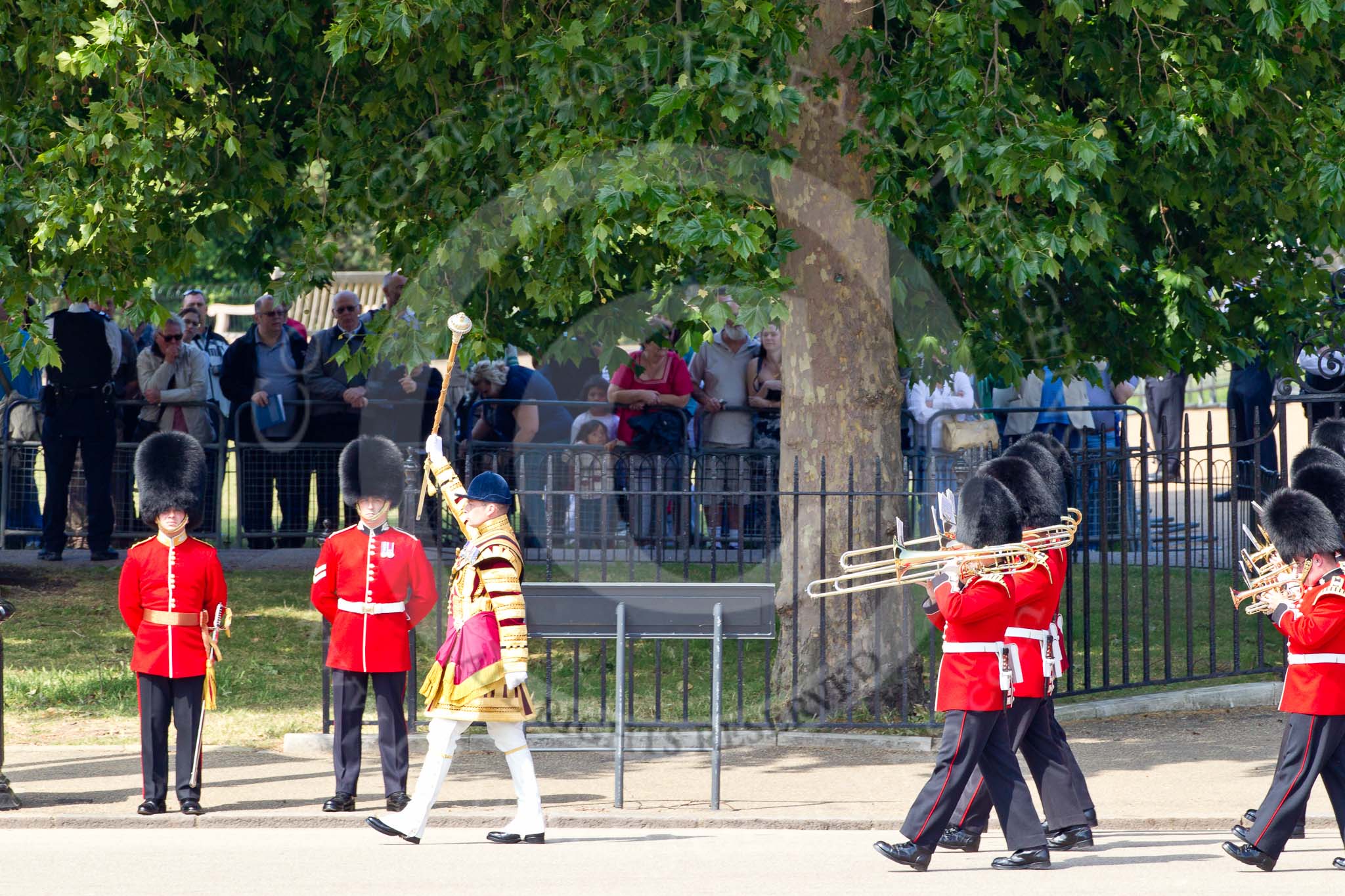 The Colonel's Review 2011: Drum Major Scott Fitzgerald, Coldstream Guards, leading the Band of the Coldstream Guards onto Horse Guards Parade. In the background spectators watching from St. James's Park.. Horse Guards Parade, Westminster, London SW1, United Kingdom, on 04 June 2011 at 10:26, image #24