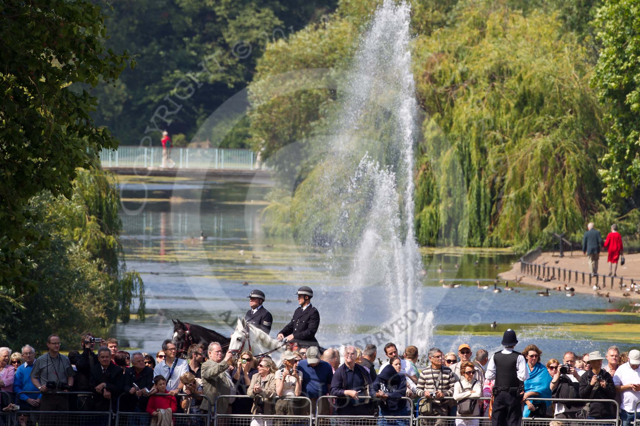 The Colonel's Review 2011: Spectators watching from St. James's Park in front of the lake and water feature. Officers of the Metropolitan Police on horseback patrolling.. Horse Guards Parade, Westminster, London SW1, United Kingdom, on 04 June 2011 at 10:28, image #29