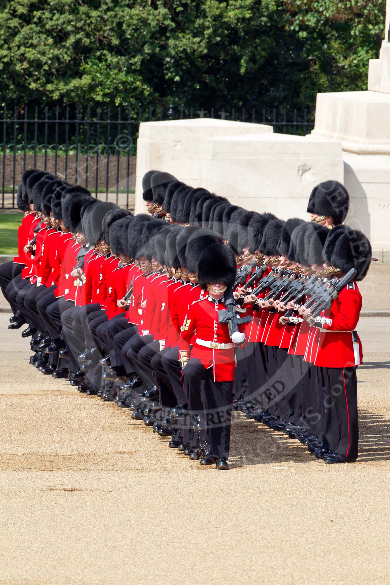 The Colonel's Review 2011: No. 3 Guard, F Company Scots Guards, taking up their place on the parade ground. In the background the Guards Memorial, in front Company Sergeant Major N D Lawrie.. Horse Guards Parade, Westminster, London SW1, United Kingdom, on 04 June 2011 at 10:35, image #50