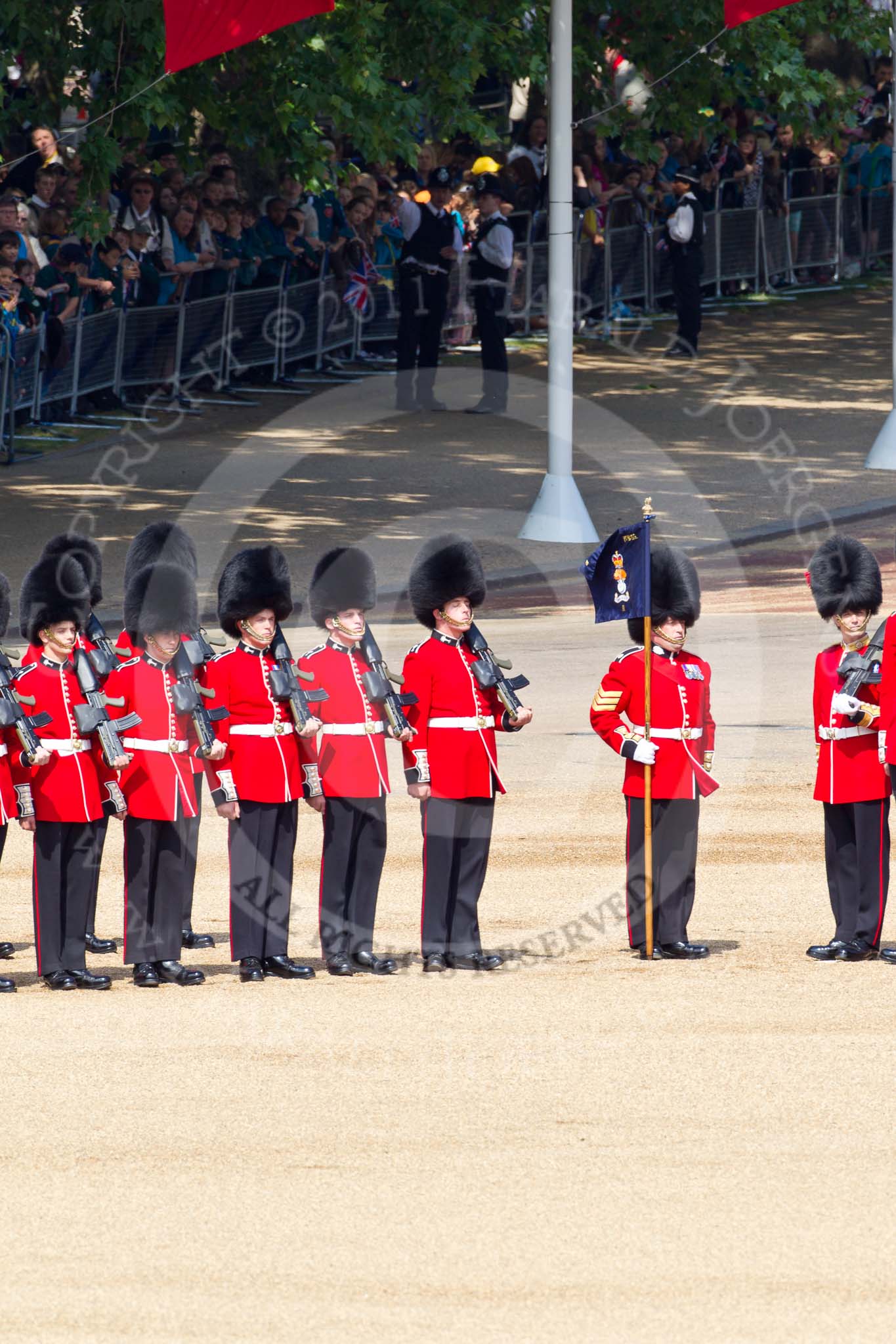 The Colonel's Review 2011: No. 1 Guard, 1st Battalion Scots Guards, the Escort for the Colour. In front, with the white colour belt, Lieutenant Tom Ogilvy, the Ensign that will troop the Colour through the ranks. In the background spectators watching from St. James's Park.. Horse Guards Parade, Westminster, London SW1, United Kingdom, on 04 June 2011 at 10:42, image #57
